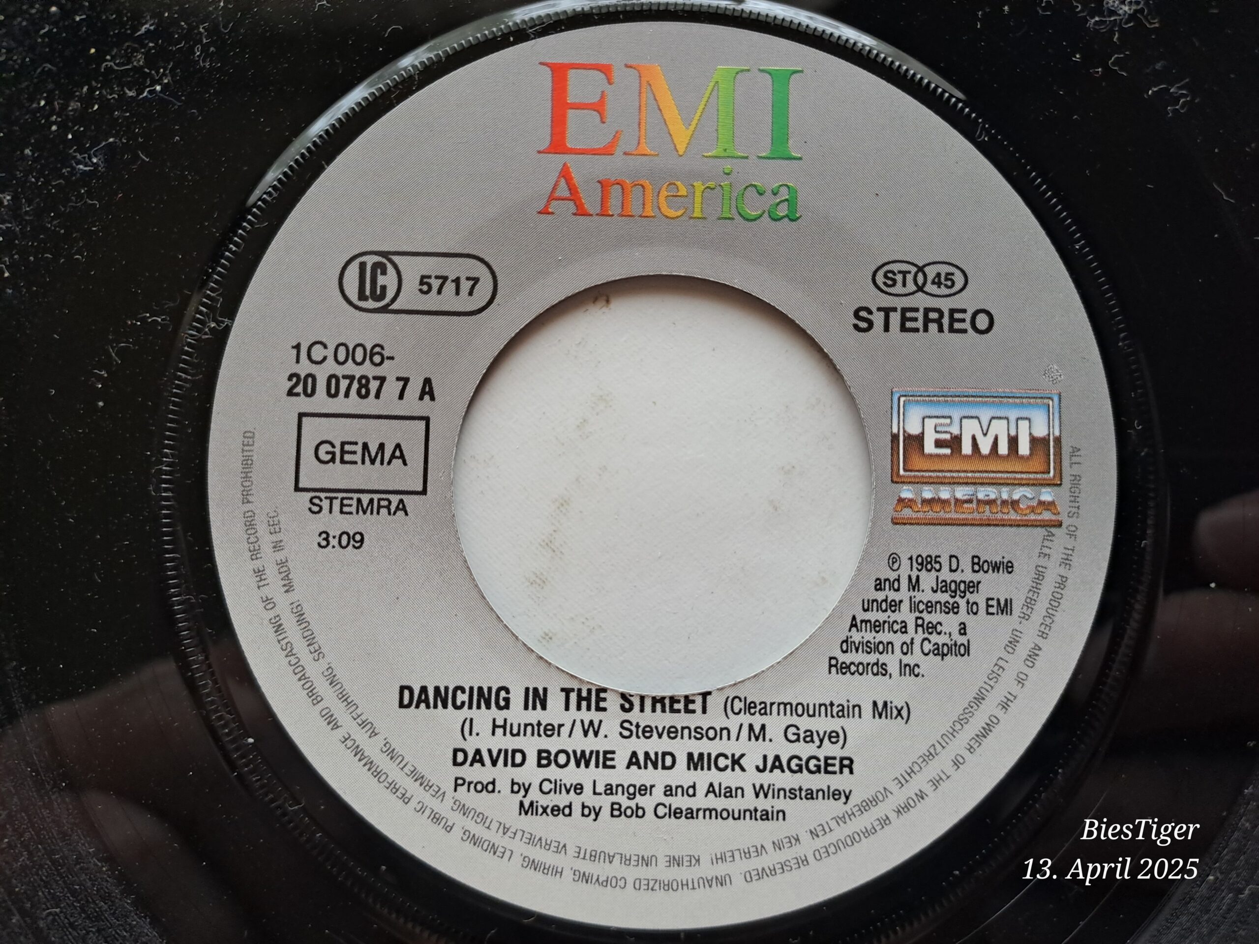 David Bowie And Mick Jagger – Dancing In The Street (1985) EMI America – 1C 006 20 0787 7 Trackliste Seite 1 1 Dancing In The Street (Clearmountain Mix) 3:09 Seite 2 1 Dancing In The Street (Instrumental) 3:18