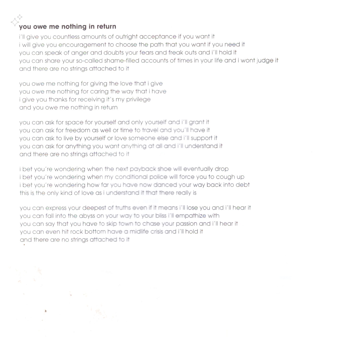| 9 | You Owe Me Nothing In Return | 4:58 | |