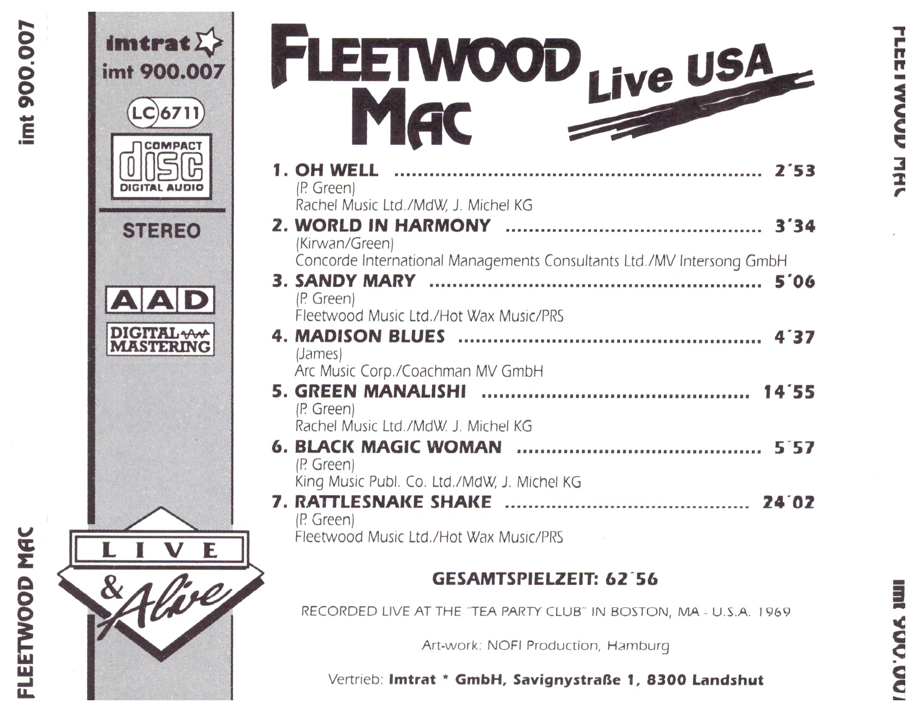 Fleetwood Mac – Live USA (1990) Imtrat – imt 900.007 Trackliste 1 Oh Well 2:53 2 World In Harmony 3:34 3 Sandy Mary 5:06 4 Madison Blues 4:37 5 Green Manalishi 14:55 6 Black Magic Woman 5:57 7 Rattlesnake Shake 24:02
