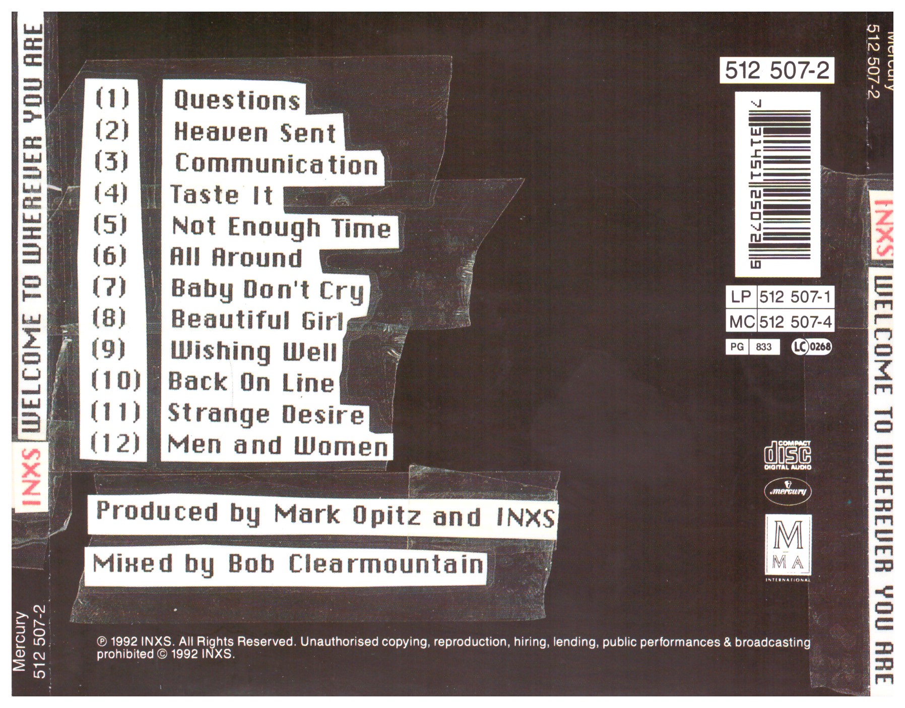INXS – Welcome To Wherever You Are (1992) Mercury – 512-507-2 Trackliste 1 Questions 2 Heaven Sent 3 Communication 4 Taste It 5 Not Enough Time 6 All Around 7 Baby Don’t Cry 8 Beautiful Girl 9 Wishing Well 10 Back On Line 11 Strange Desire 12 Men And Women Booklet
