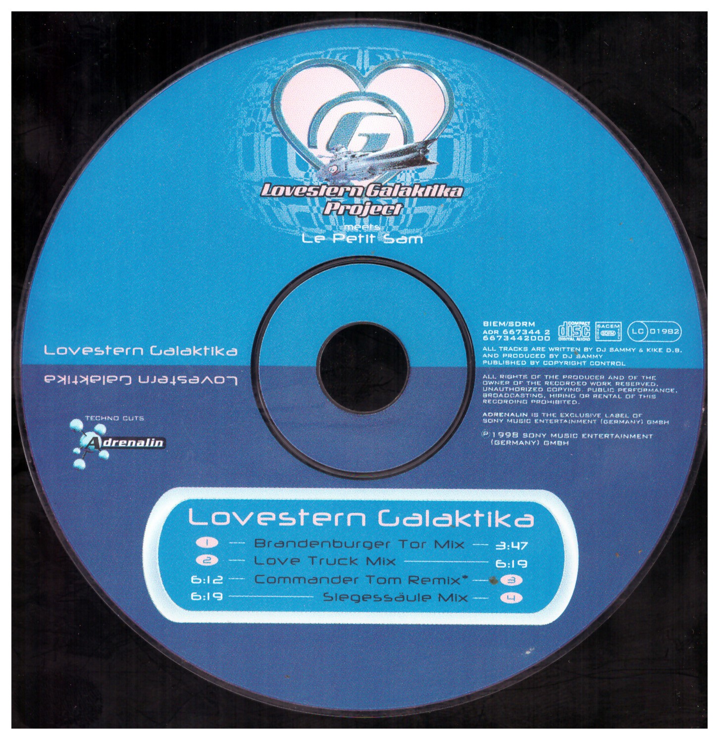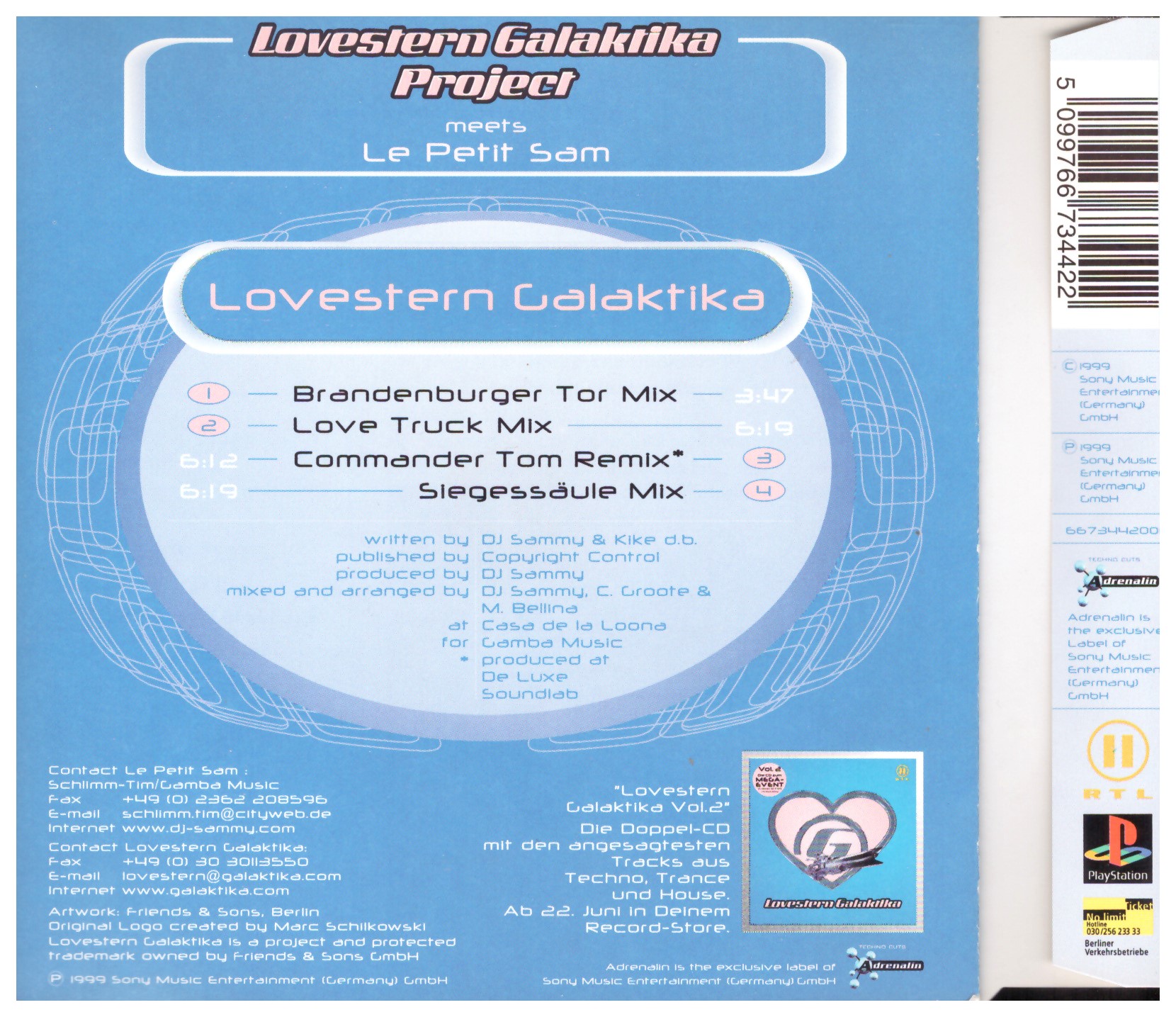 Lovestern Galaktika Project Meets Le Petit Sam – Lovestern Galaktika (1999) Adrenalin – ADR 667344 2 Trackliste 1 Lovestern Galaktika (Brandenburger Tor Mix) 3:47 2 Lovestern Galaktika (Love Truck Mix) 6:19 3 Lovestern Galaktika (Commander Tom Remix) 6:12 4 Lovestern Galaktika (Siegessäule Mix) 6:19