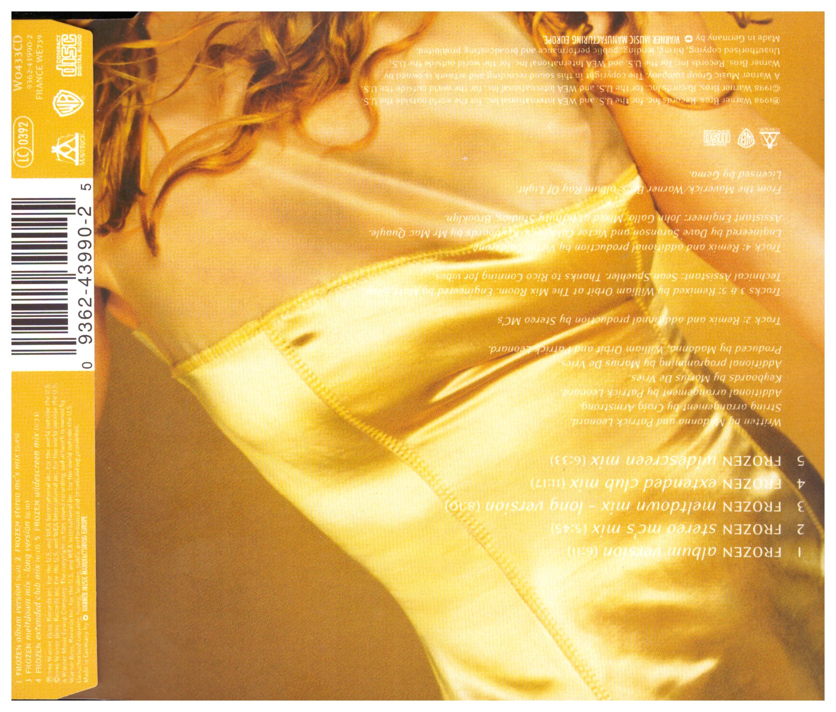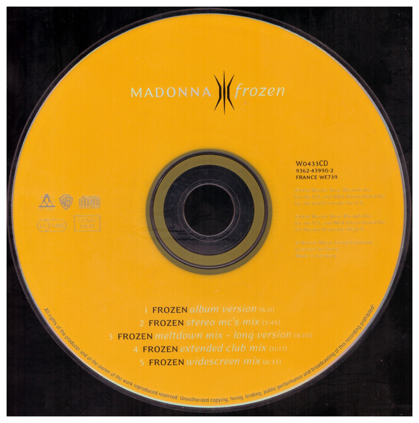Madonna – Frozen (1998) Warner Bros. Records – W0433CD Trackliste 1 Frozen (Album Version) 6:11 2 Frozen (Stereo MC’s Mix) 5:45 3 Frozen (Meltdown Mix – Long Version) 8:10 4 Frozen (Extended Club Mix) 11:17 5 Frozen (Widescreen Mix) 6:33