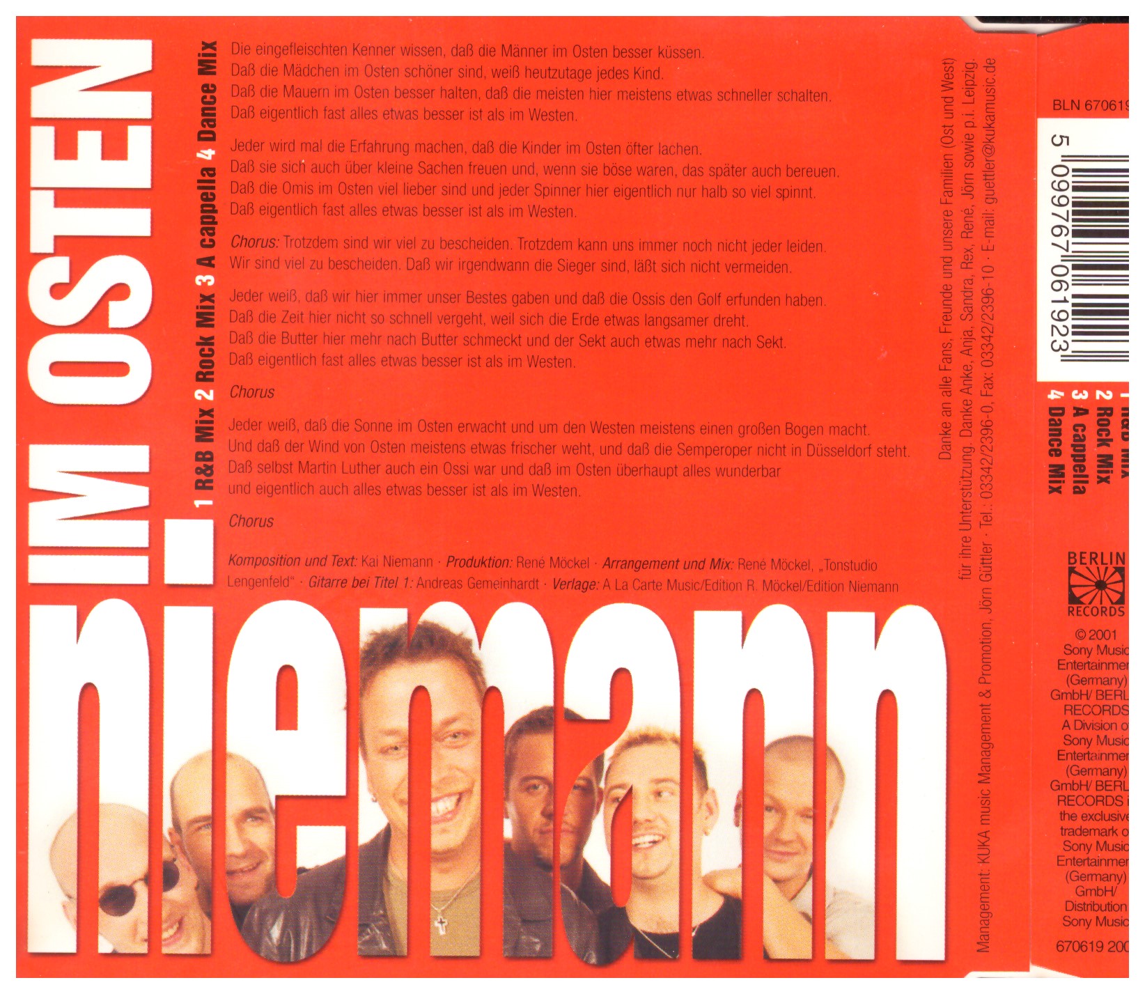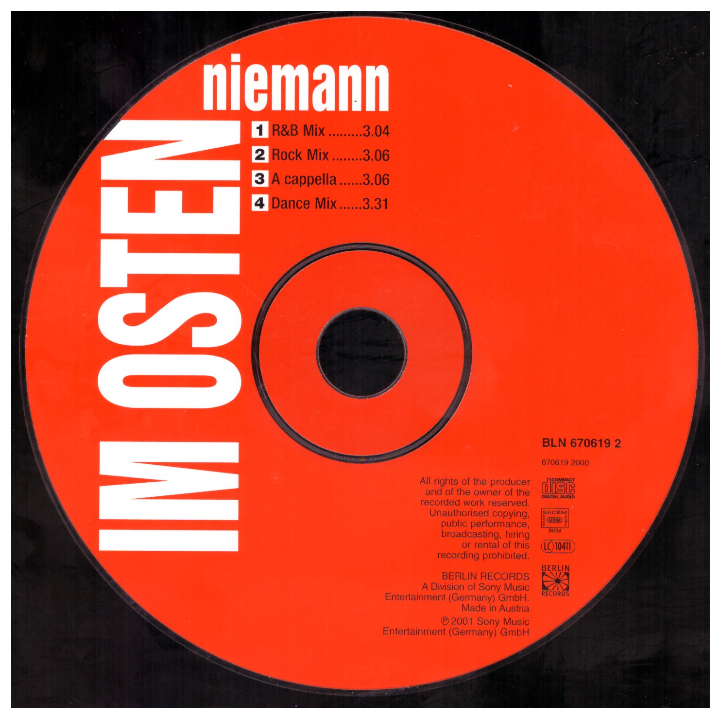 Niemann – Im Osten (2001) Berlin Records – BLN 670619 2 Trackliste 1 Im Osten (R&B Mix) 3:04 2 Im Osten (Rock Mix) 3:06 3 Im Osten (A Cappella) 3:06 4 Im Osten (Dance Mix) 3:31