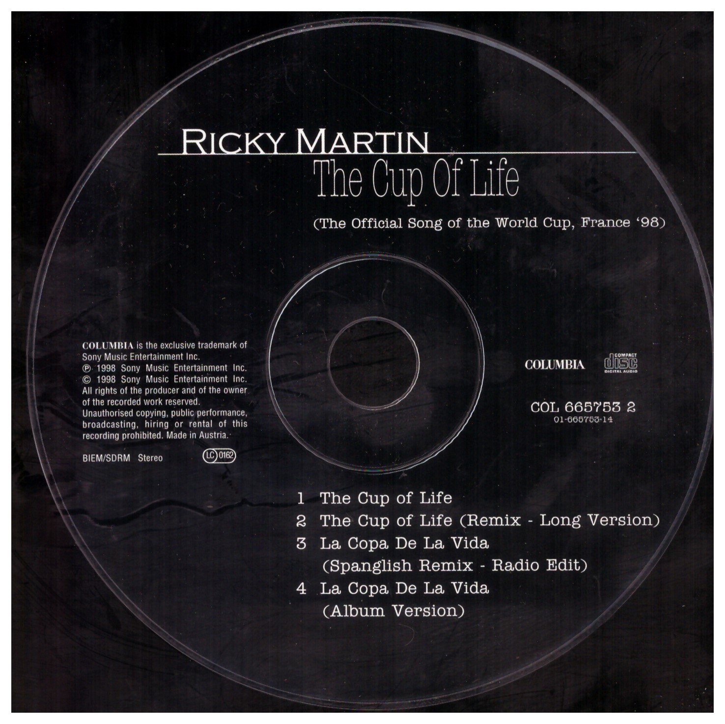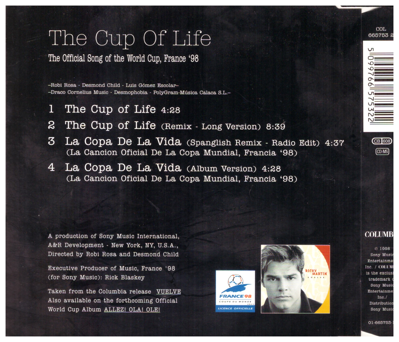 Ricky Martin – The Cup Of Life (The Official Song Of The World Cup, France ’98) (1998) Columbia – COL 665753 2 Trackliste 1 The Cup Of Life 4:28 2 The Cup Of Life (Remix – Long Version) 8:39 3 La Copa De La Vida (Spanglish Remix – Radio Edit) 4:37 4 La Copa De La Vida (Album Version) 4:28