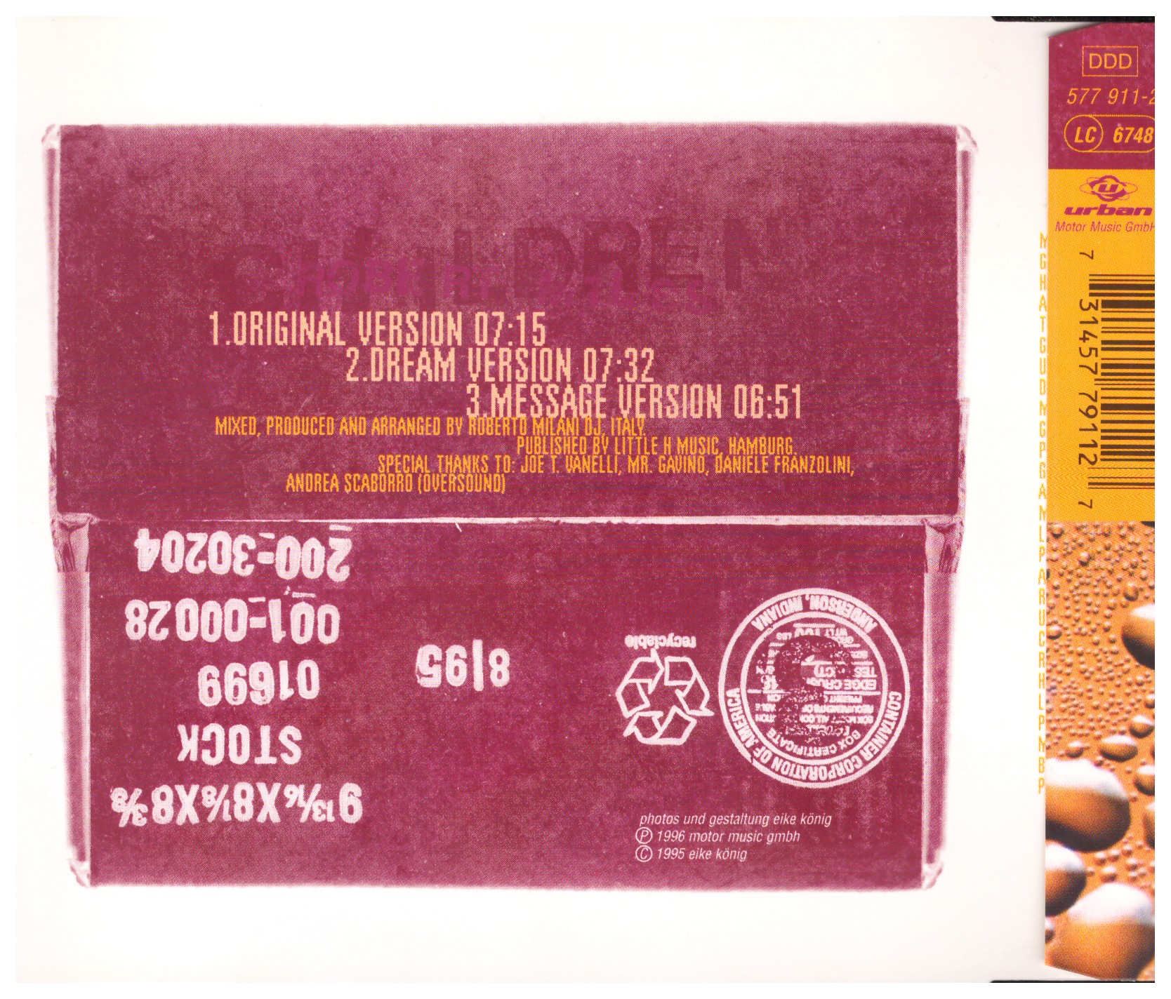 Robert Miles – Children (1996) Urban – 577 911-2 Trackliste 1 Children (Original Version) 7:15 2 Children (Dream Version) 7:32 3 Children (Message Version) 6:51