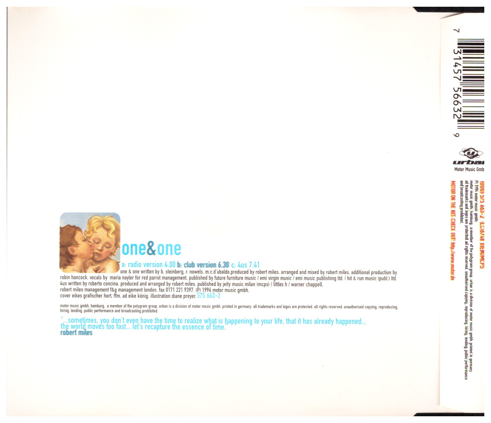Robert Miles Feat. Maria Nayler – One & One (1996) Urban – 575 663-2 Trackliste 1 One & One (Radio Version) 4:00 2 One & One (Club Version) 6:30 3 4Us 7:41