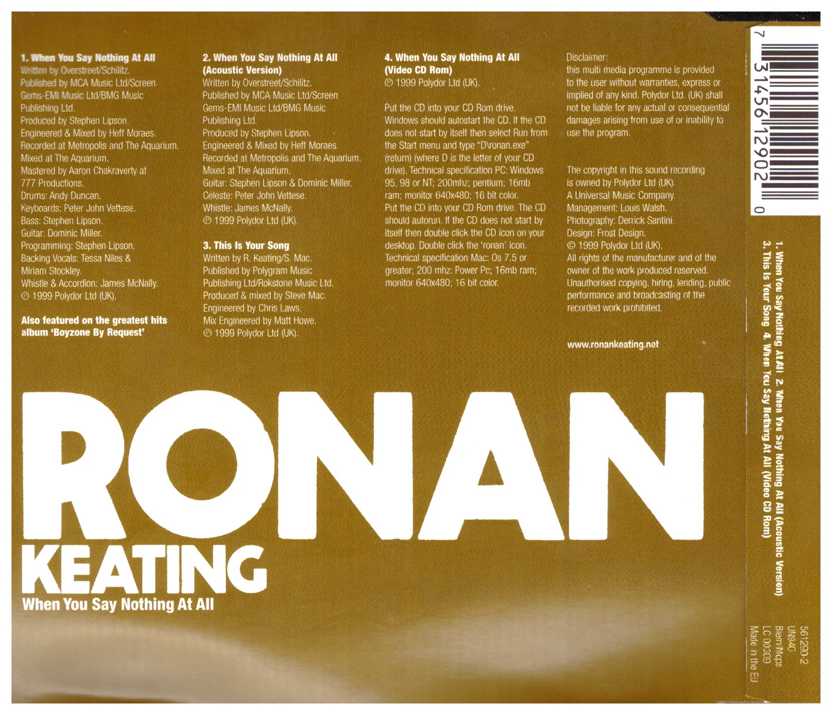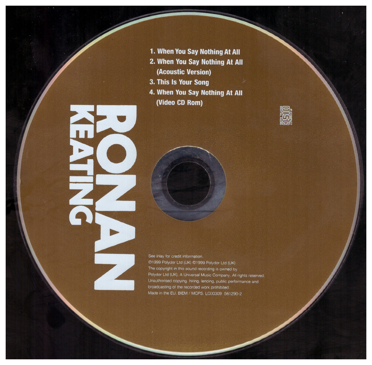 Ronan Keating – When You Say Nothing At All (1999) Polydor – 561290-2 Trackliste 1 When You Say Nothing At All 4:18 2 When You Say Nothing At All (Acoustic Version) 3:31 3 This Is Your Song 3:48 Video When You Say Nothing At All