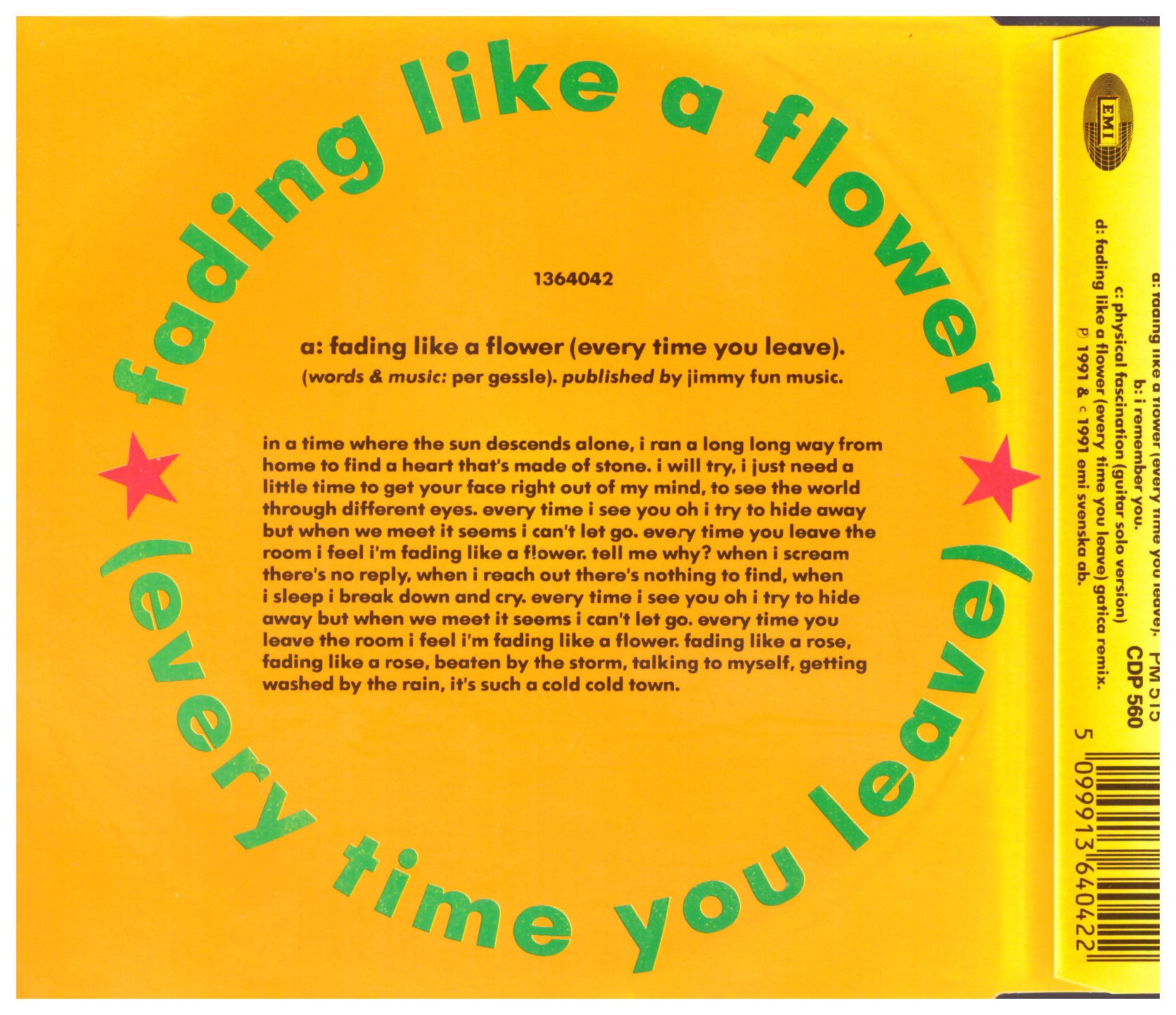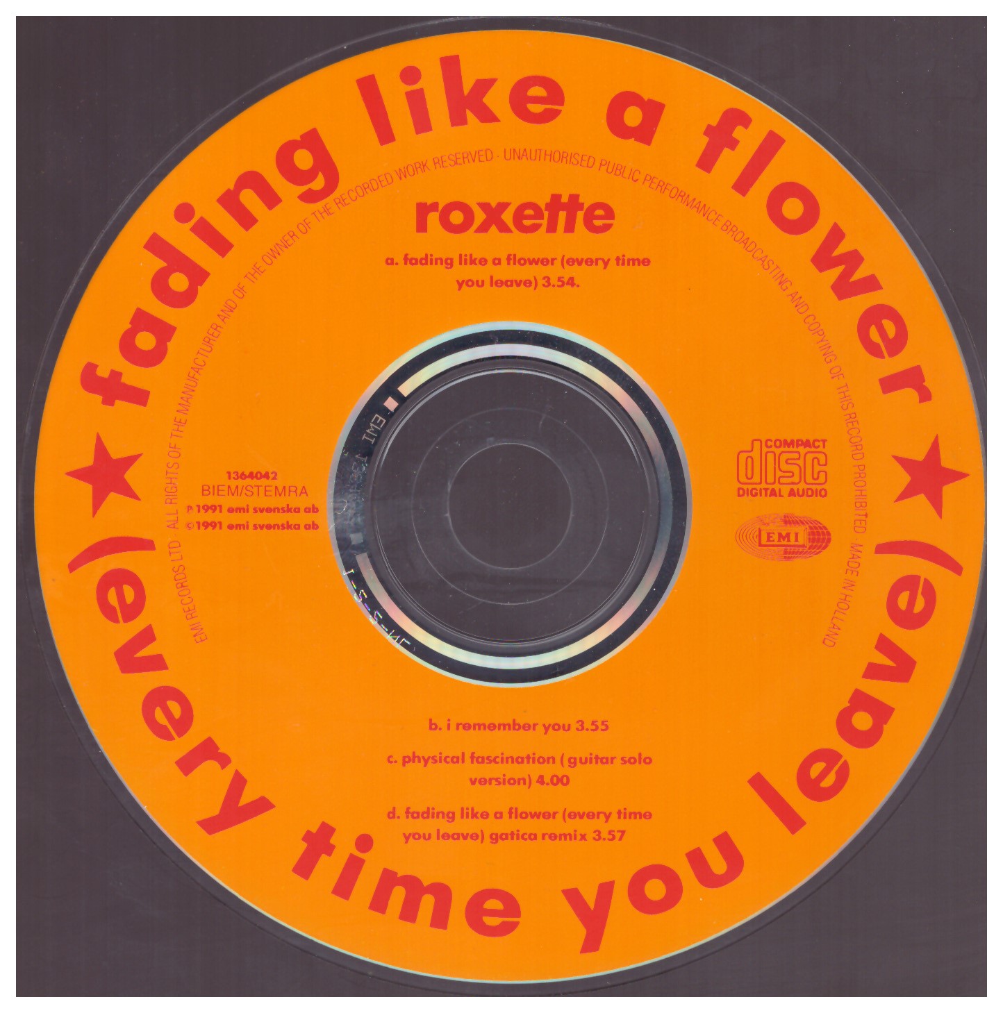 Roxette – Fading Like A Flower (Every Time You Leave) (1991) EMI – 1364042 Trackliste 1 Fading Like A Flower (Every Time You Leave) 3:54 2 I Remember You 3:55 3 Physical Fascination (Guitar Solo Version) 4:00 4 Fading Like A Flower (Every Time You Leave) (Gatica Remix) 3:57