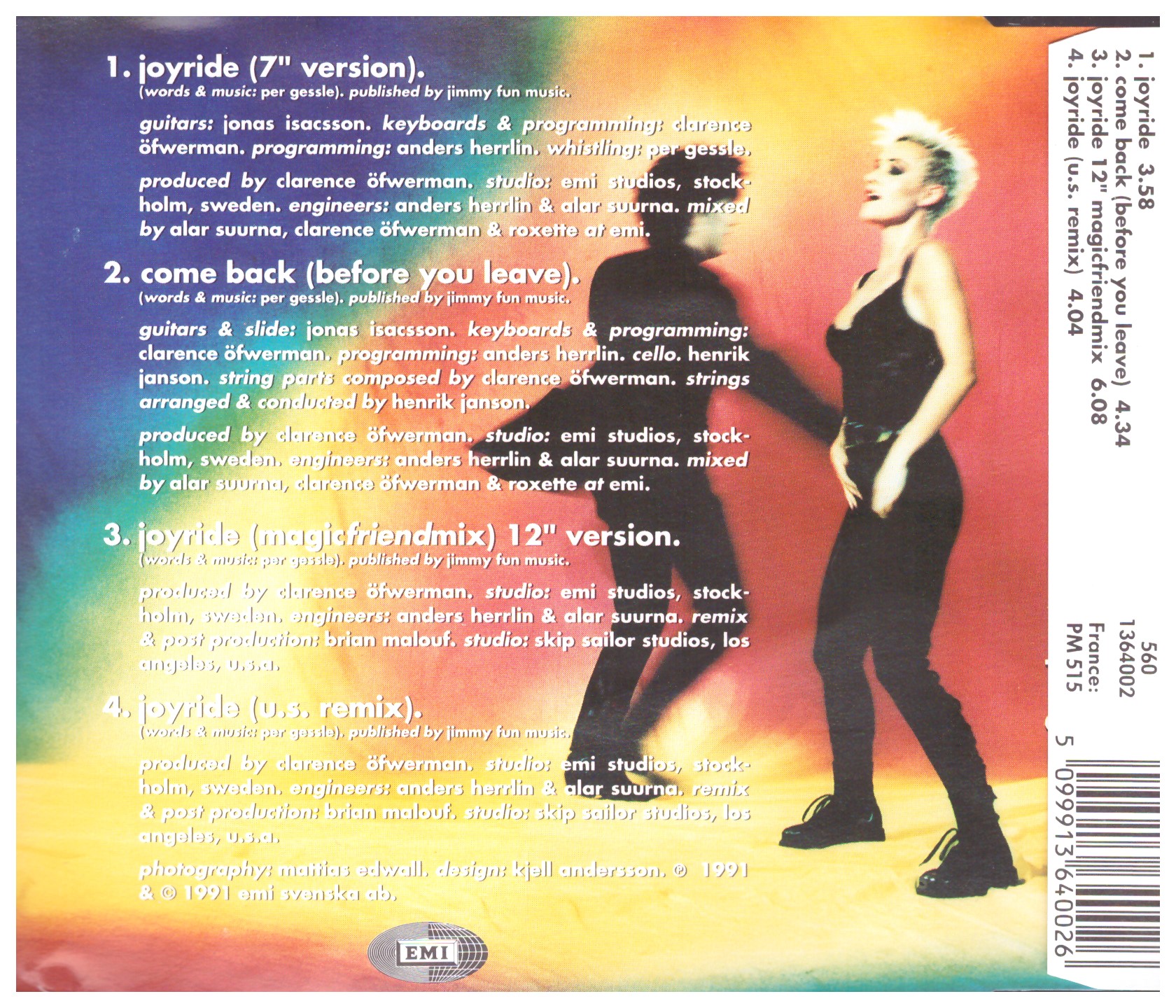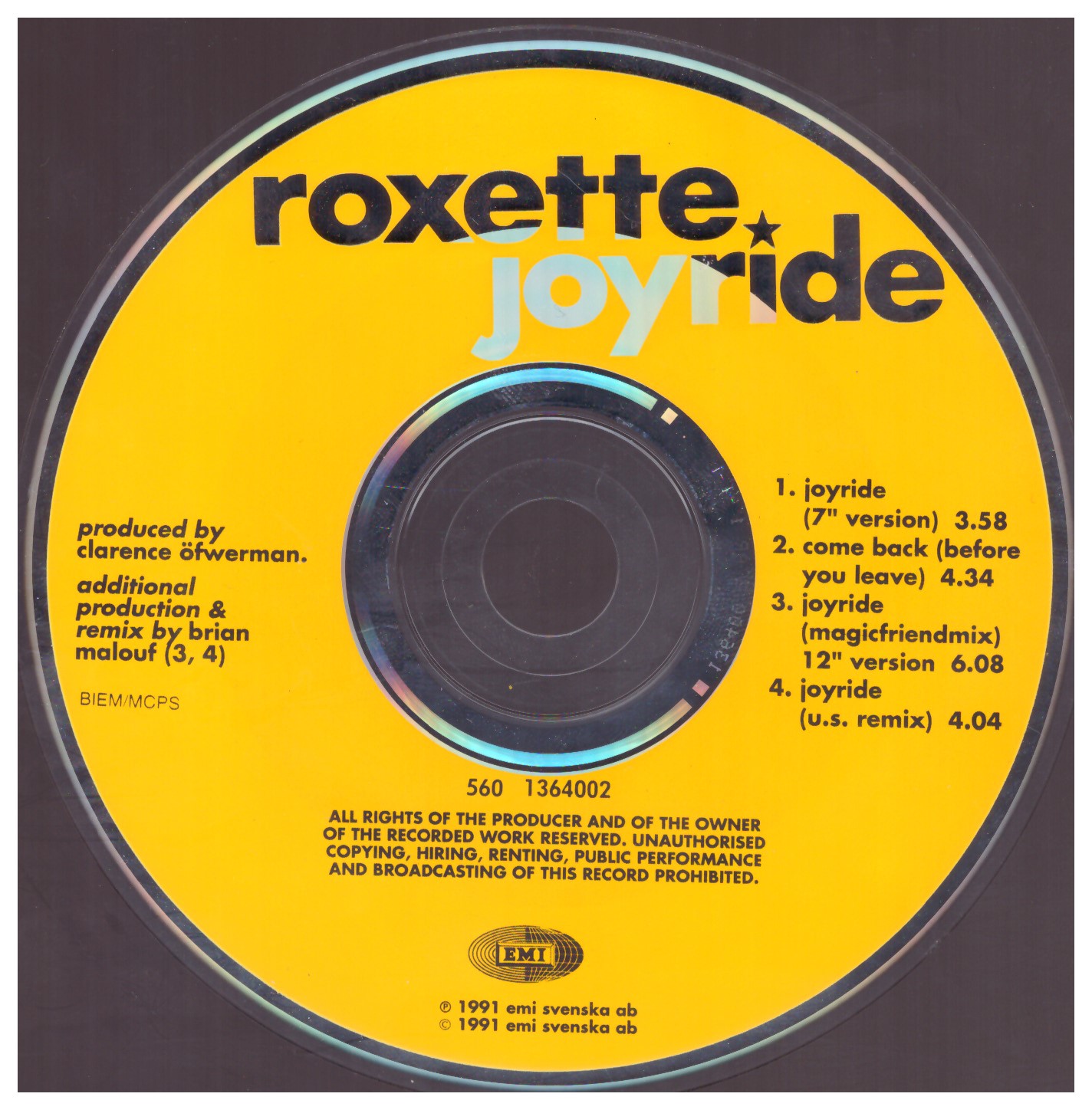 Roxette – Joyride (1991) EMI – 1364002 Trackliste 1 Joyride (7″ Version) 3:58 2 Come Back (Before You Leave) 4:34 3 Joyride (Magicfriendmix 12″ Version) 6:08 4 Joyride (U.S. Remix) 4:04