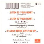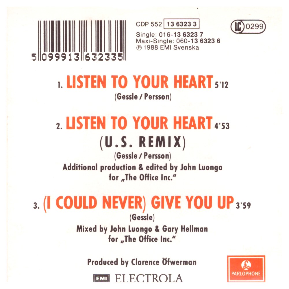 Roxette – Listen To Your Heart (1988) Parlophone – CDP 552 13 6323 3 (Mini-CD) Trackliste 1 Listen To Your Heart 5:12 2 Listen To Your Heart (U.S. Remix) 4:53 3 (I Could Never) Give You Up 3:59