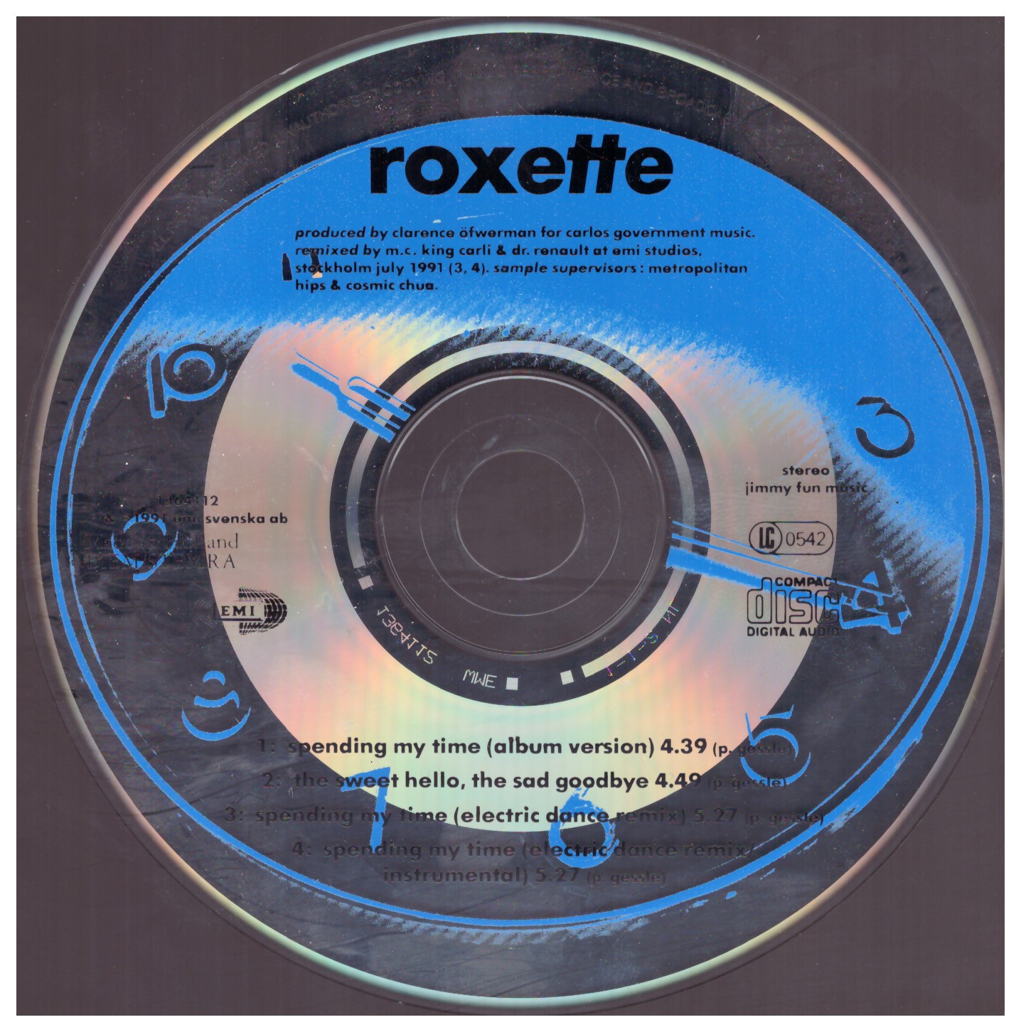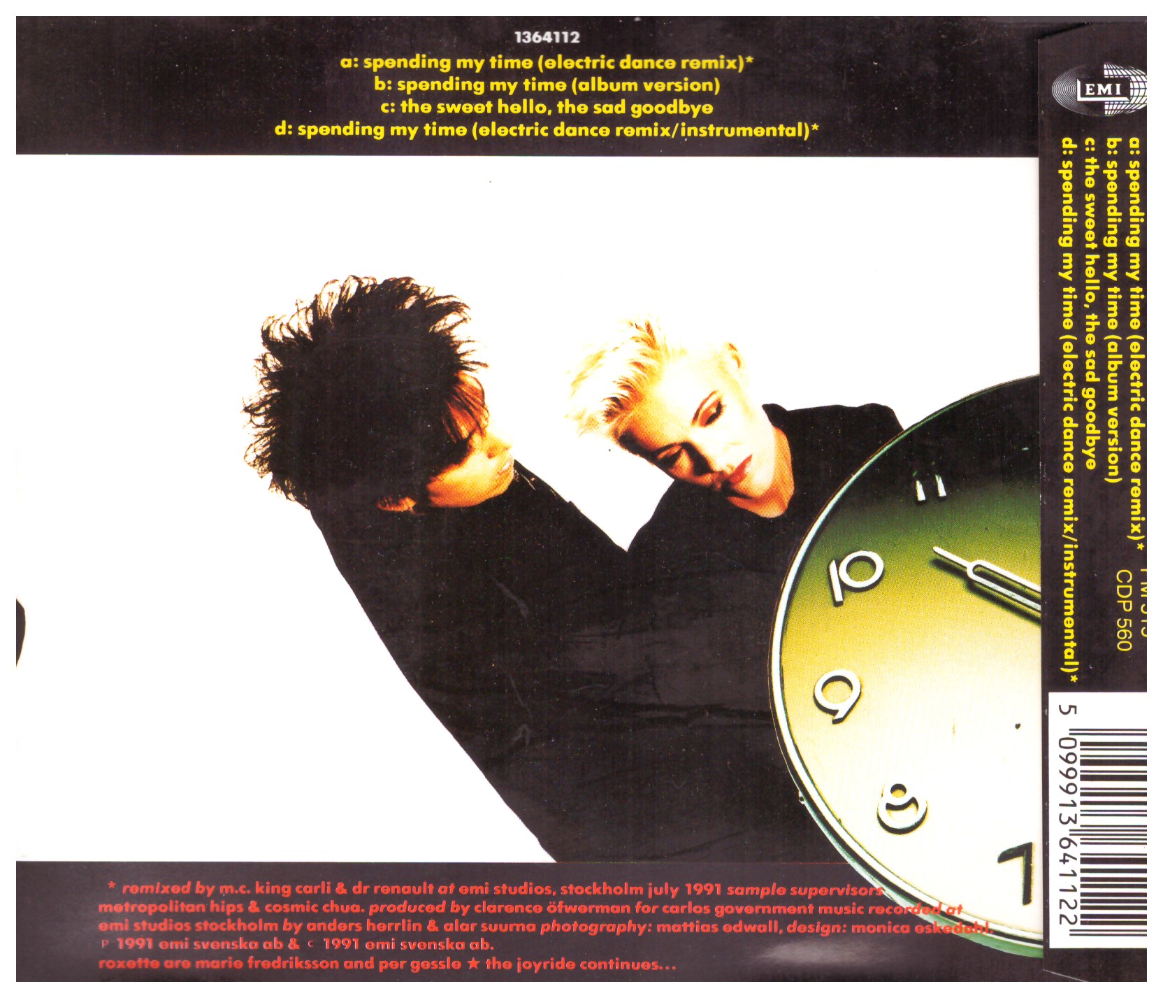 Roxette – Spending My Time (1991) EMI – 1364112 Trackliste 1 Spending My Time (Album Version) 4:39 2 The Sweet Hello, The Sad Goodbye 4:49 3 Spending My Time (Electric Dance Remix) 5:27 4 Spending My Time (Electric Dance Remix / Instrumental) 5:27
