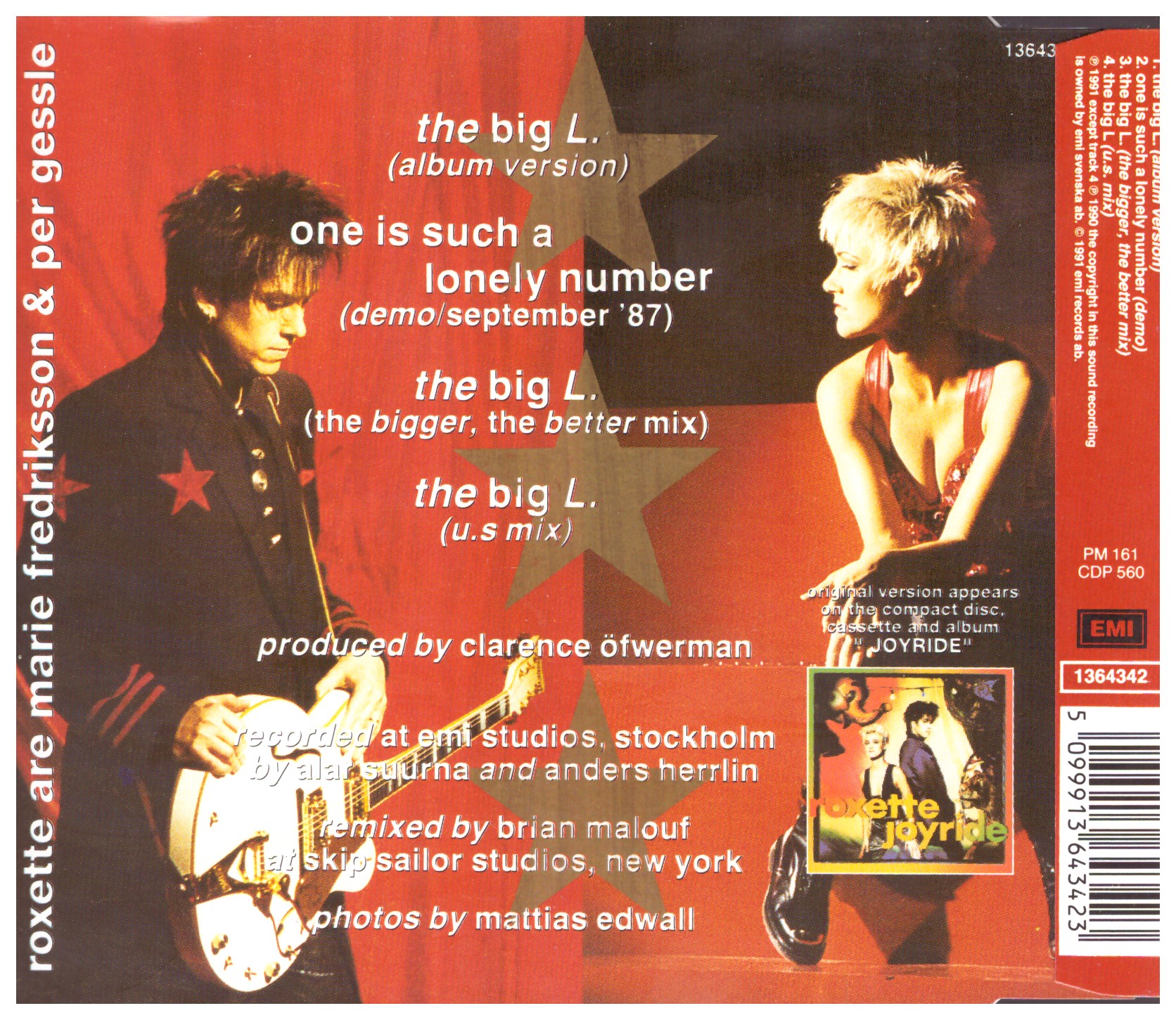 Roxette – The Big L. (1991) EMI – 1364342 Trackliste 1 The Big L. (Album Version) 4:29 2 One Is Such A Lonely Number (Demo/September ’87) 3:33 3 The Big L. (The Bigger, The Better Mix) 6:17 4 The Big L. (U.S. Mix) 4:35