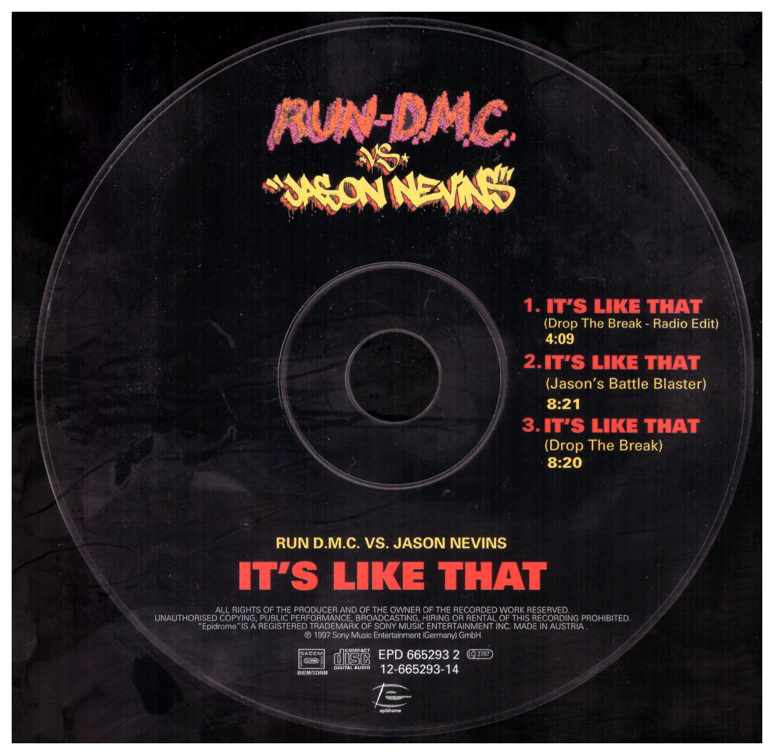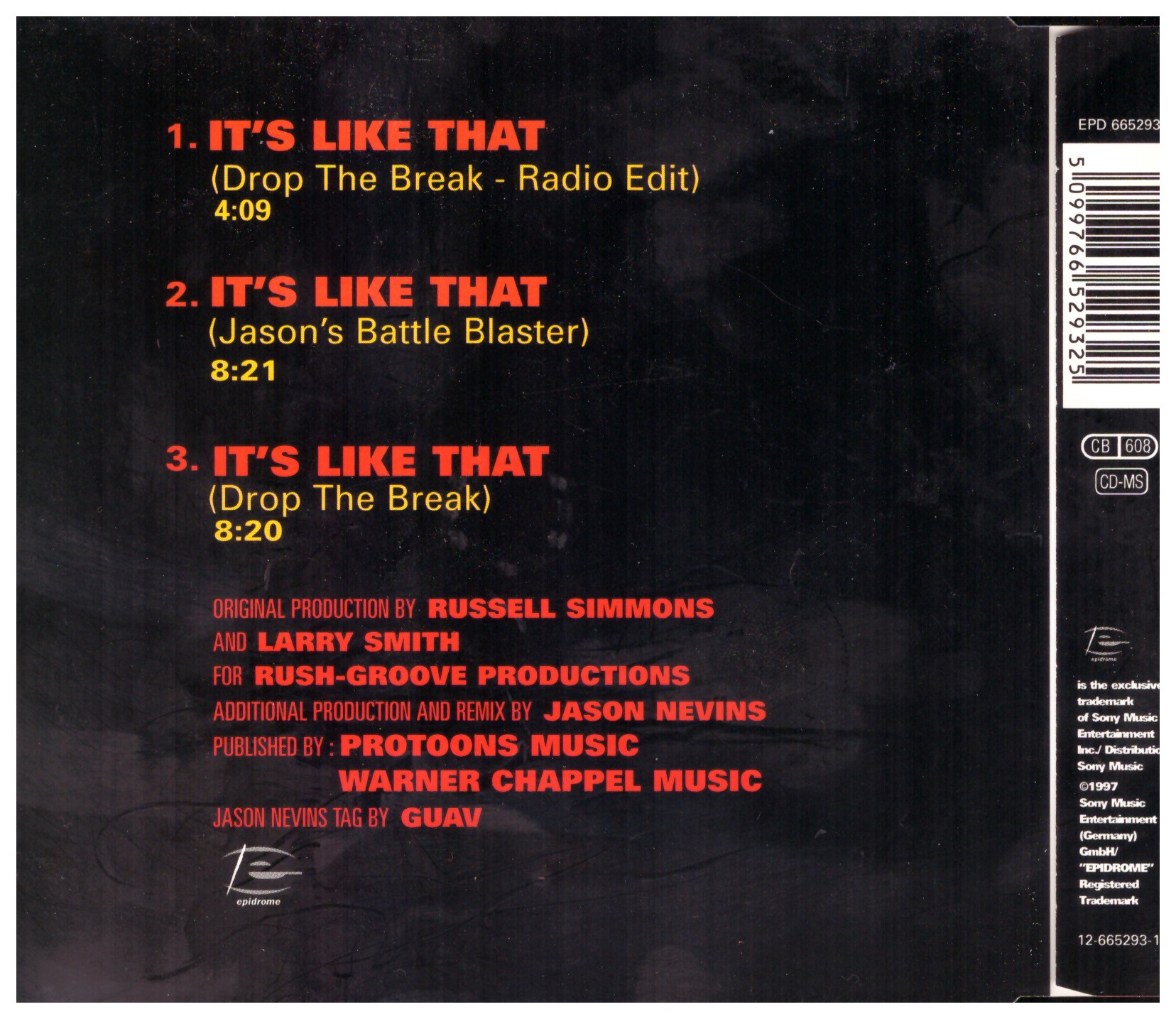 Run-D.M.C. Vs. Jason Nevins – It’s Like That (1997) Epidrome – EPD 665293 2 Trackliste 1 It’s Like That (Drop The Break – Radio Edit) 4:09 2 It’s Like That (Jason’s Battle Blaster) 8:21 3 It’s Like That (Drop The Break) 8:20