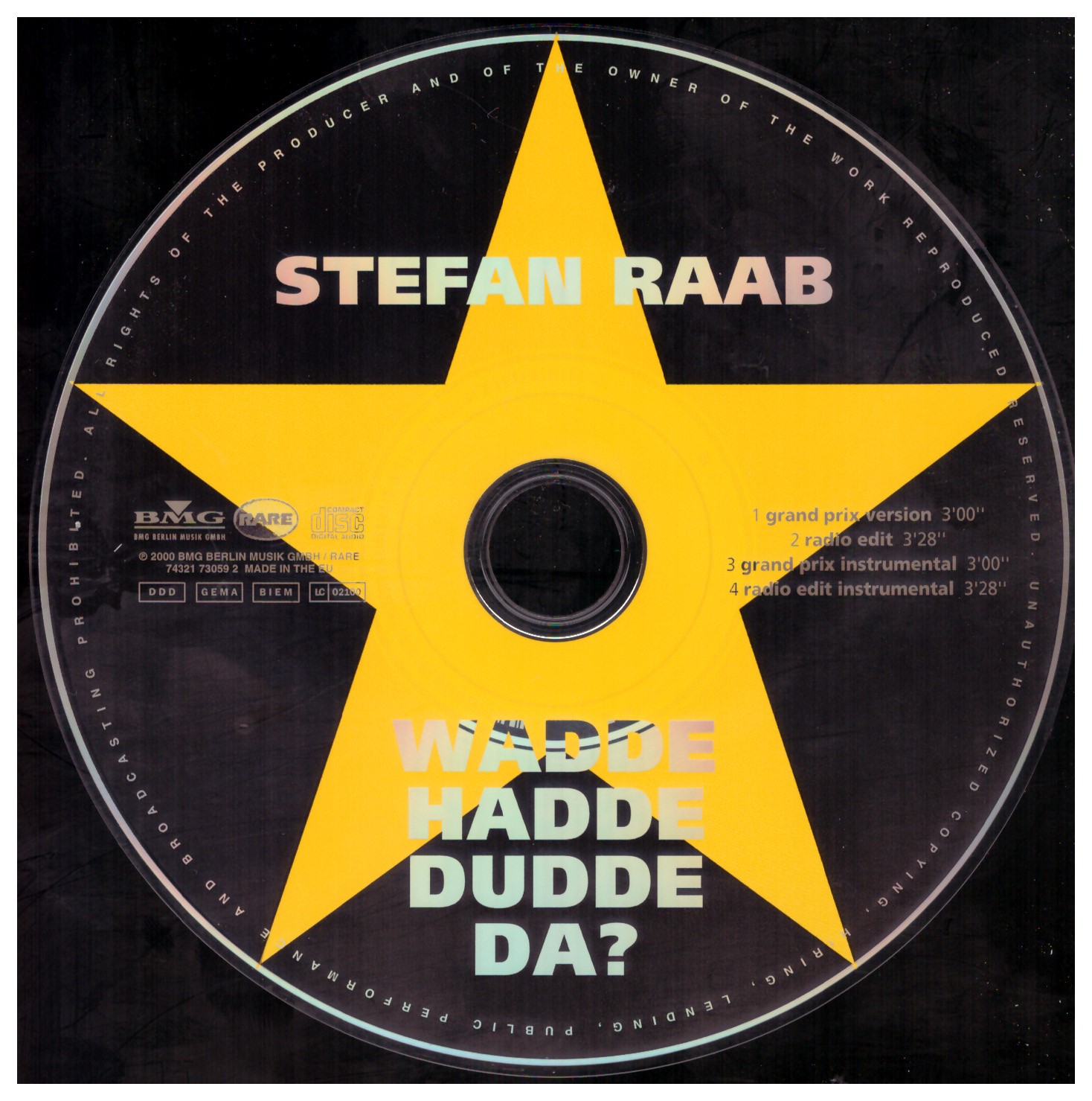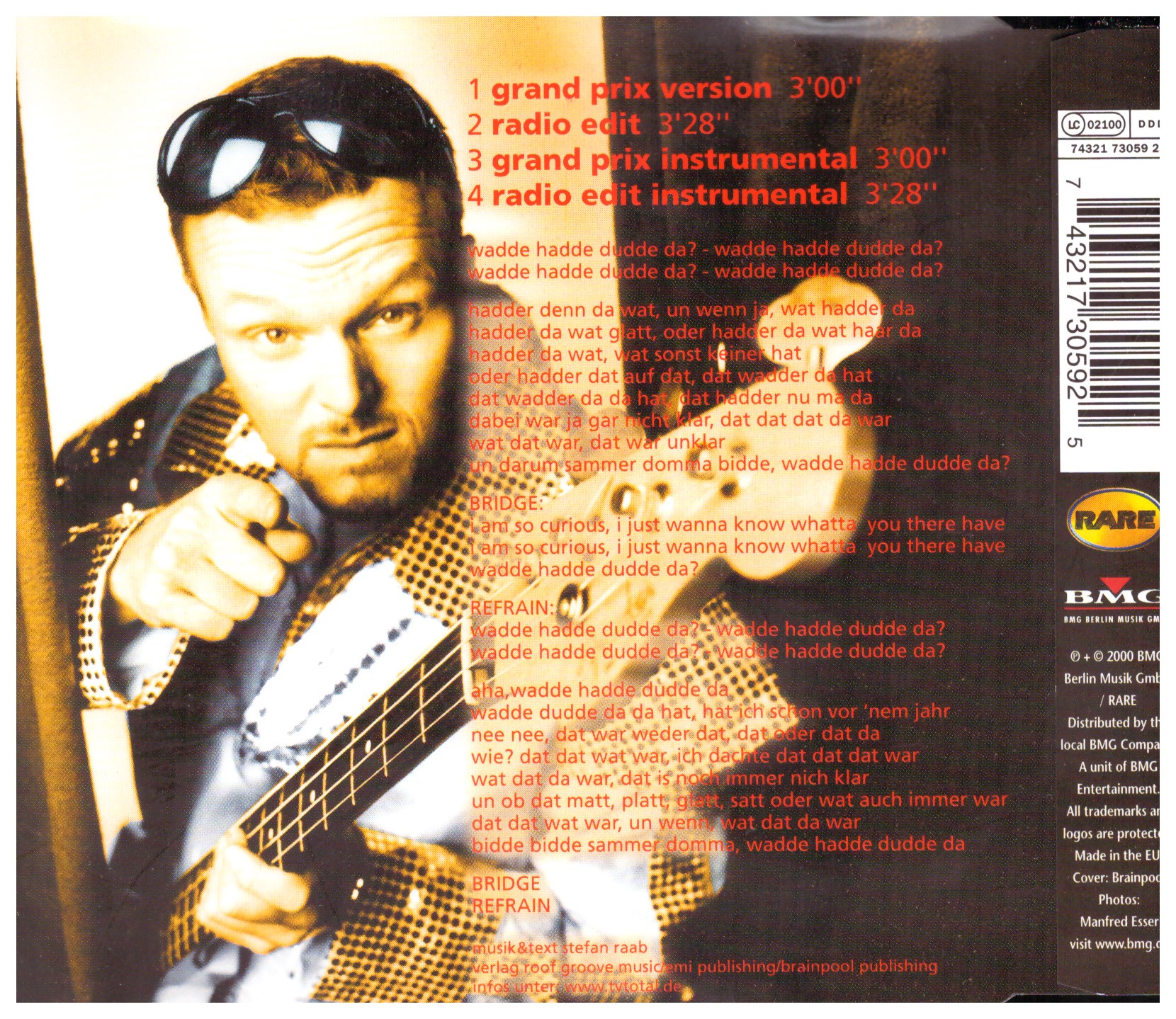 Stefan Raab – Wadde Hadde Dudde Da? (2000) Rare – 74321 73059 2 Trackliste 1 Wadde Hadde Dudde Da? (Grand Prix Version) 3:00 2 Wadde Hadde Dudde Da? (Radio Edit) 3:28 3 Wadde Hadde Dudde Da? (Grand Prix Instrumental) 3:00 4 Wadde Hadde Dudde Da? (Radio Edit Instrumental) 3:28