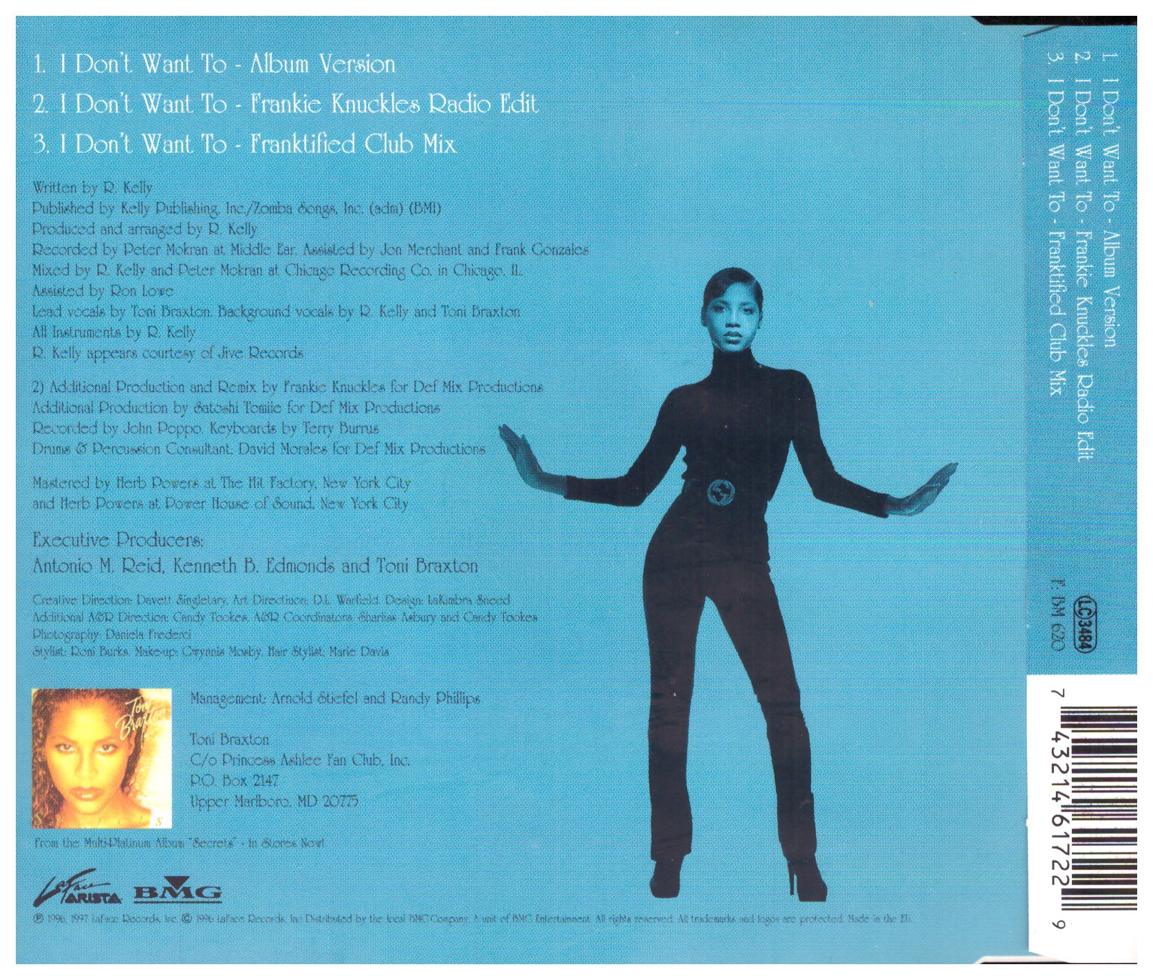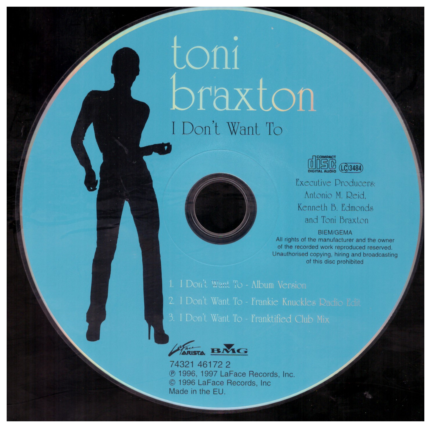 Toni Braxton – I Don’t Want To (1997) LaFace Records – 74321 46172 2 Trackliste 1 I Don’t Want To (Album Version) 4:20 2 I Don’t Want To (Frankie Knuckles Radio Edit) 3:56 3 I Don’t Want To (Franktified Club Mix) 11:00