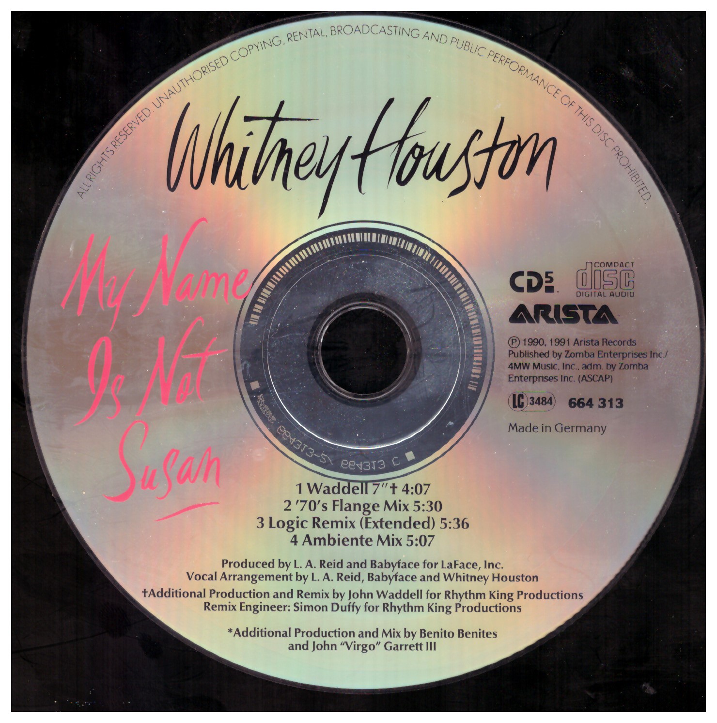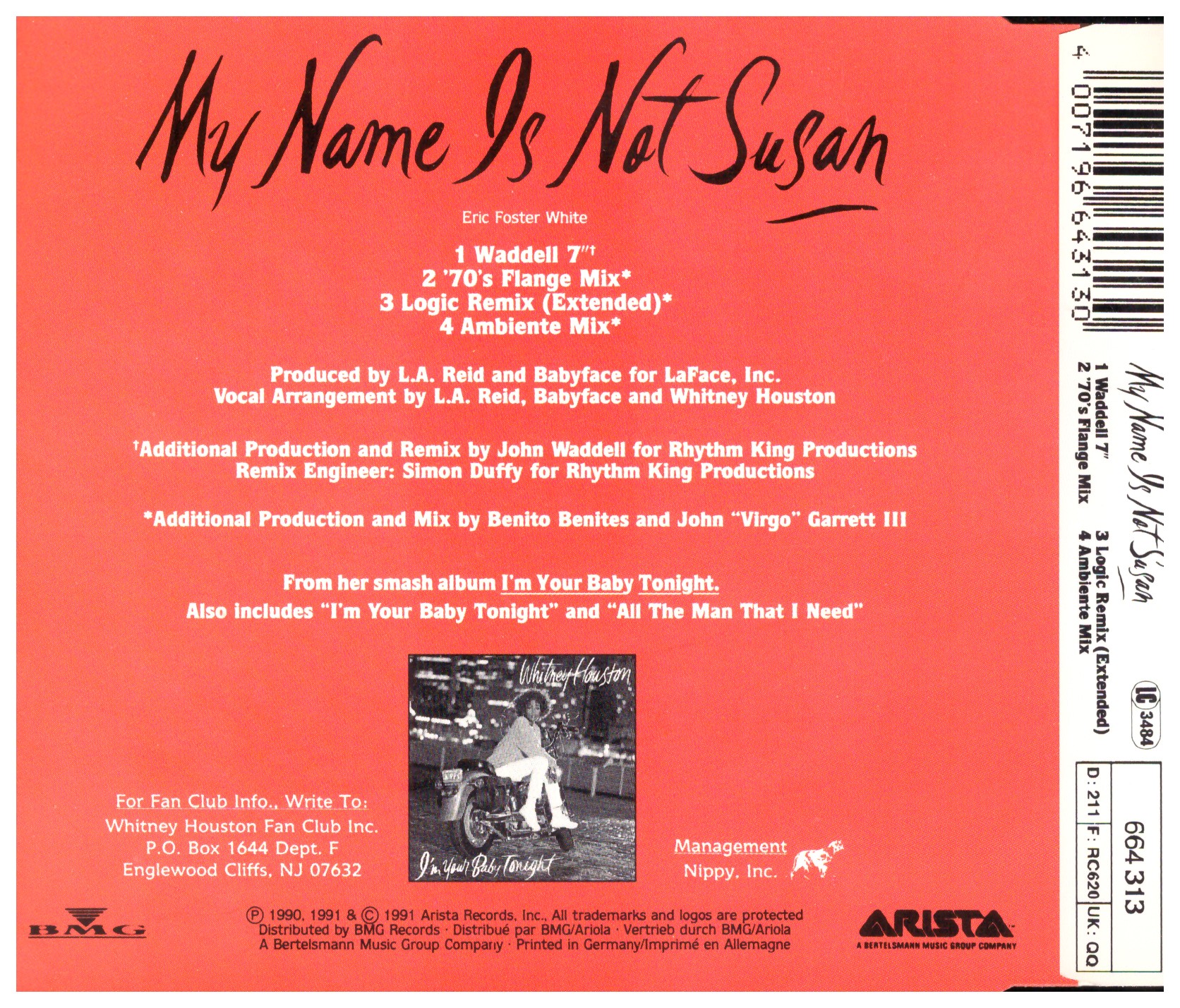 Whitney Houston – My Name Is Not Susan (1991) Arista – 664 313 Trackliste 1 My Name Is Not Susan (Waddell 7″) 4:07 2 My Name Is Not Susan (’70’s Flange Mix) 5:30 3 My Name Is Not Susan (Logic Remix) (Extended) 5:36 4 My Name Is Not Susan (Ambiente Mix) 5:07