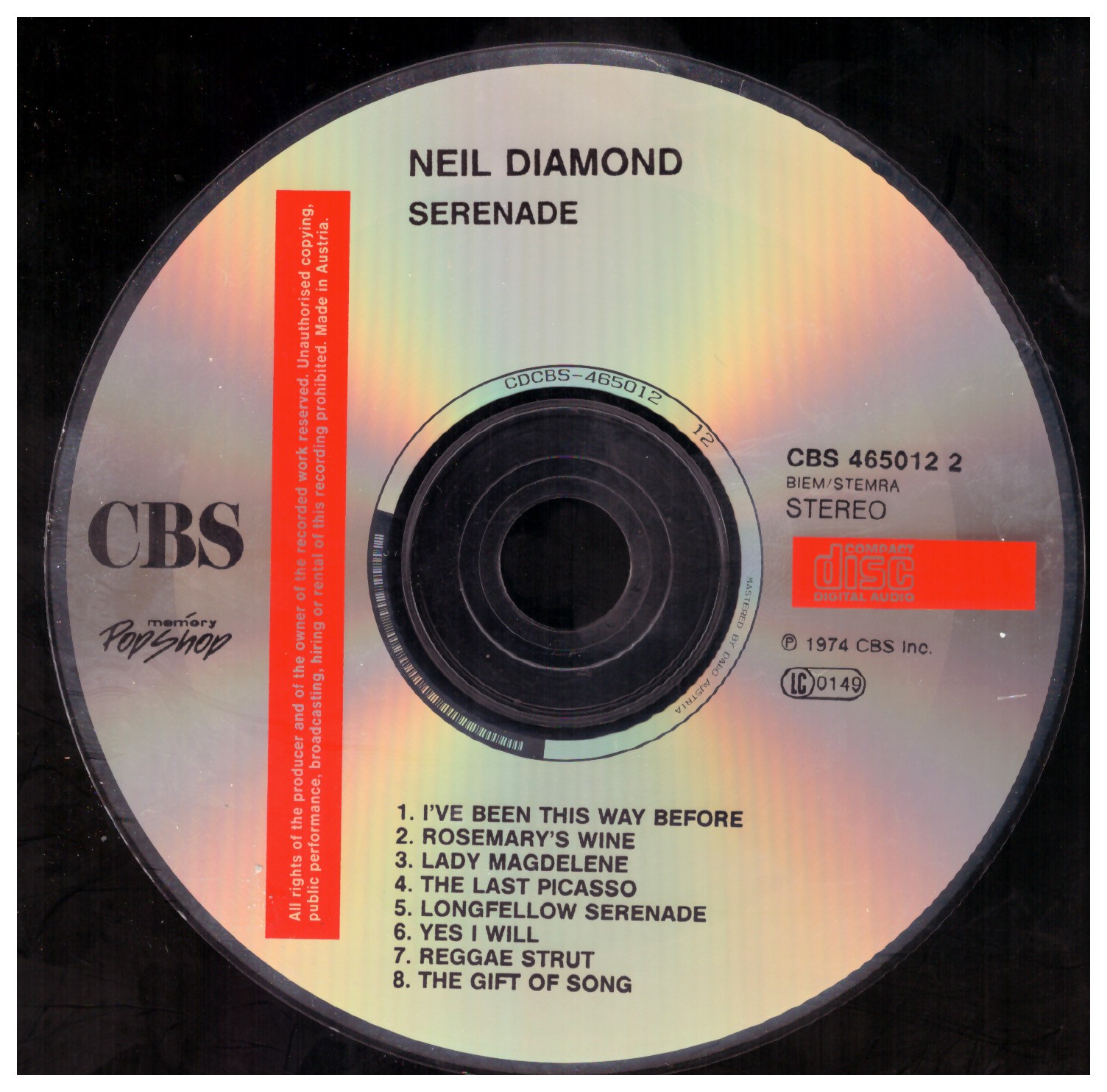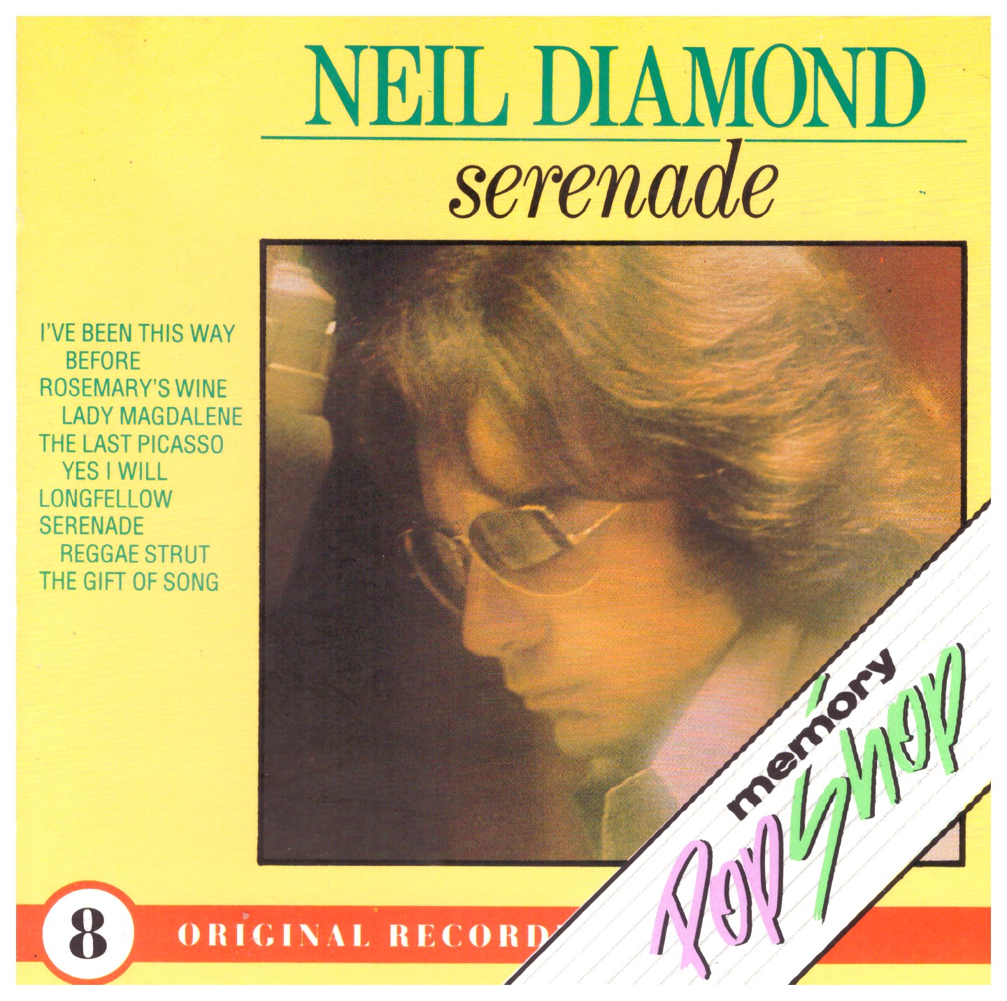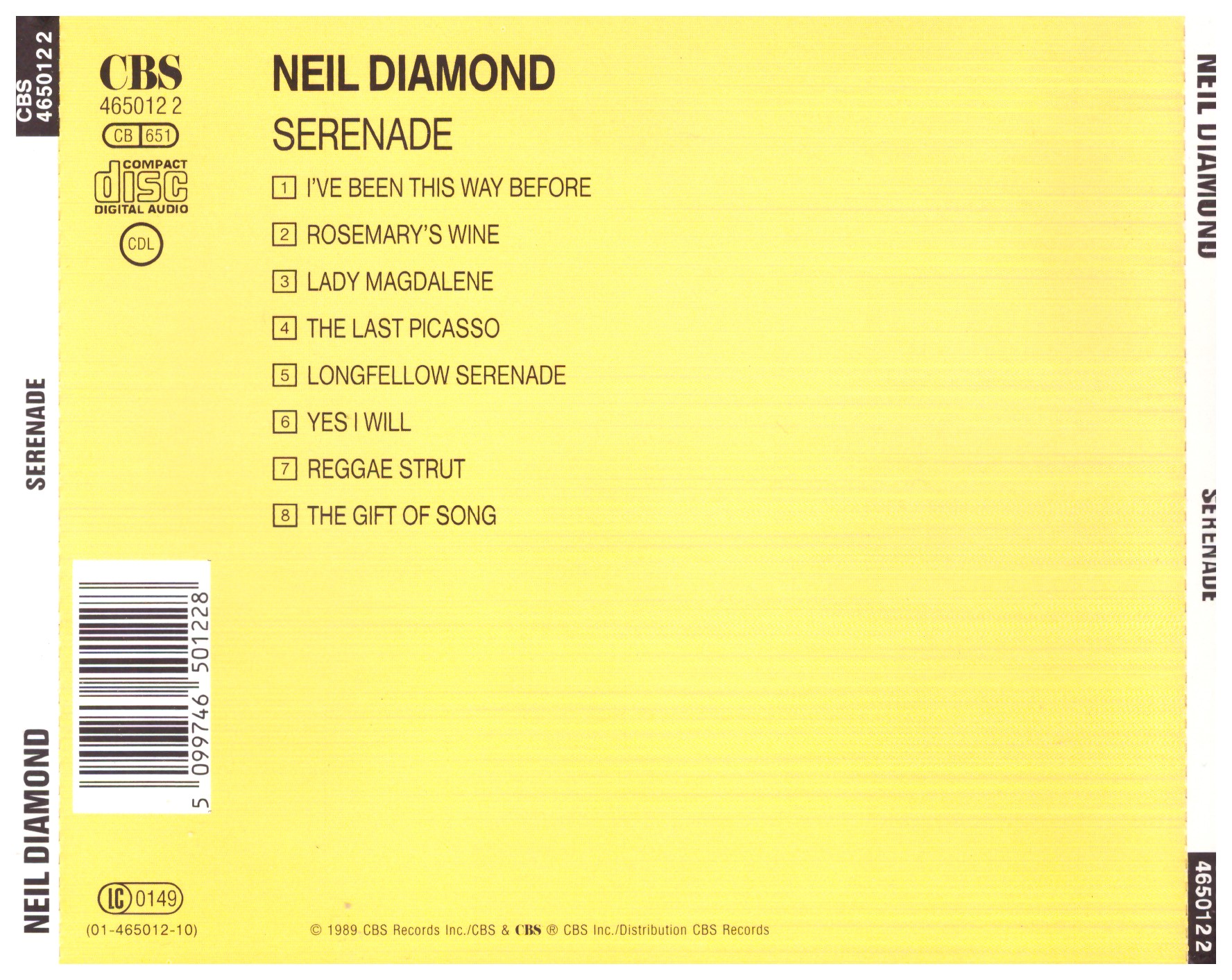 Neil Diamond – Serenade (1974 / 1989) CBS – CBS 465012 2 Trackliste 1 I’ve Been This Way Before 3:47 2 Rosemary’s Wine 2:42 3 Lady Magdelene 6:59 4 The Last Picasso 4:25 5 Longfellow Serenade 3:51 6 Yes I Will 4:37 7 Reggae Strut 3:48 8 The Gift Of Song 2:23 Booklet