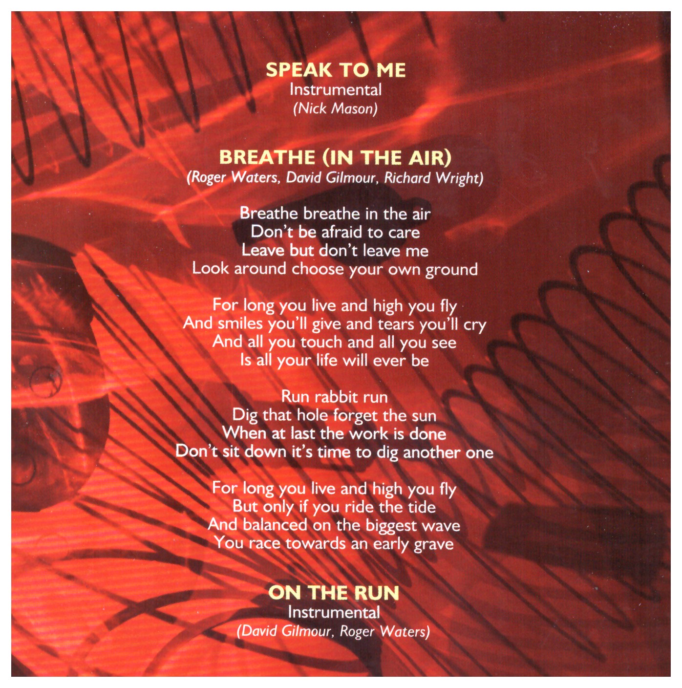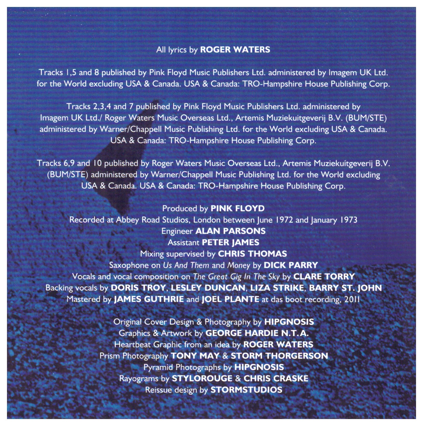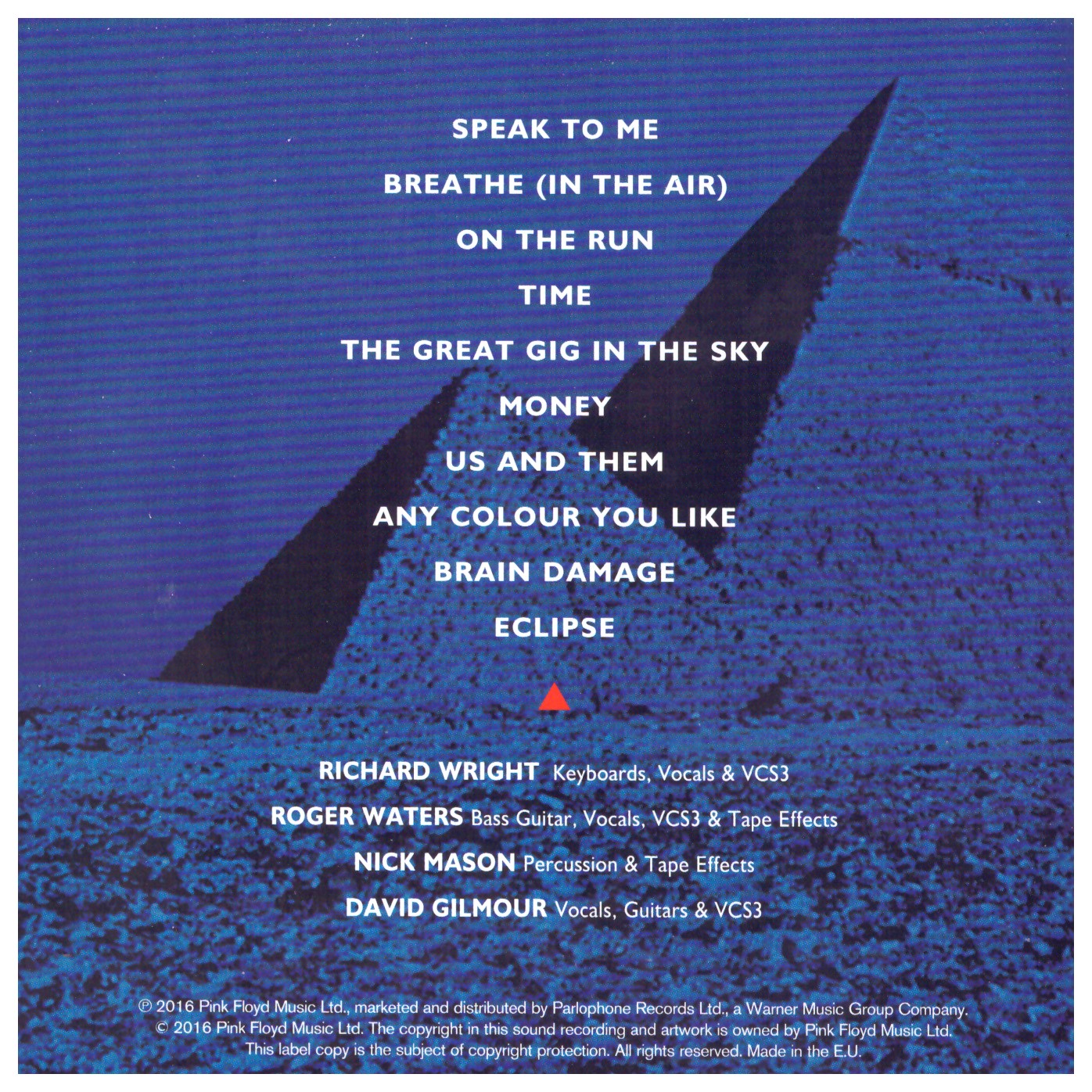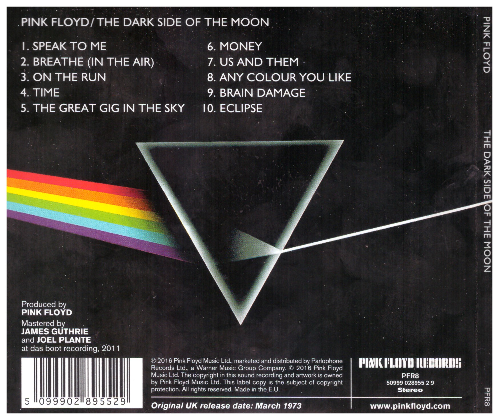 Pink Floyd – The Dark Side Of The Moon (1973 / 2011) EMI – 50999 028955 2 9 Trackliste 1 Speak To Me 1:07 2 Breathe (In The Air) 2:50 3 On The Run 3:45 4 Time 6:53 5 The Great Gig In The Sky 4:44 6 Money 6:23 7 Us And Them 7:49 8 Any Colour You Like 3:26 9 Brain Damage 3:47 10 Eclipse 2:13 Booklet