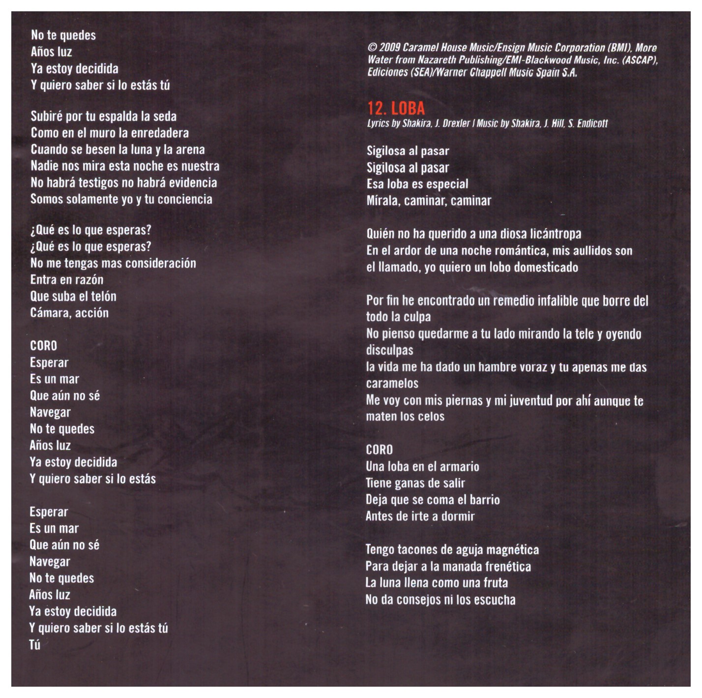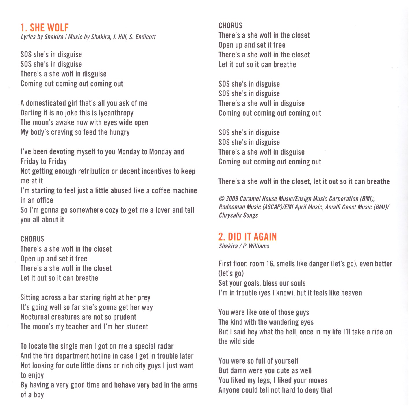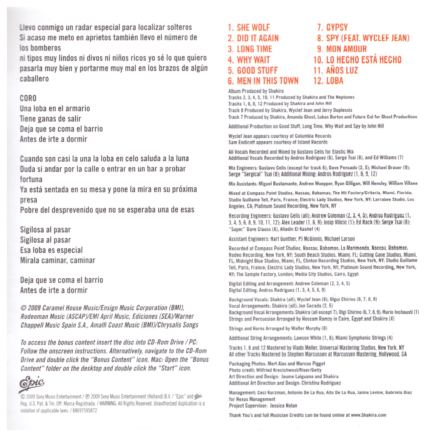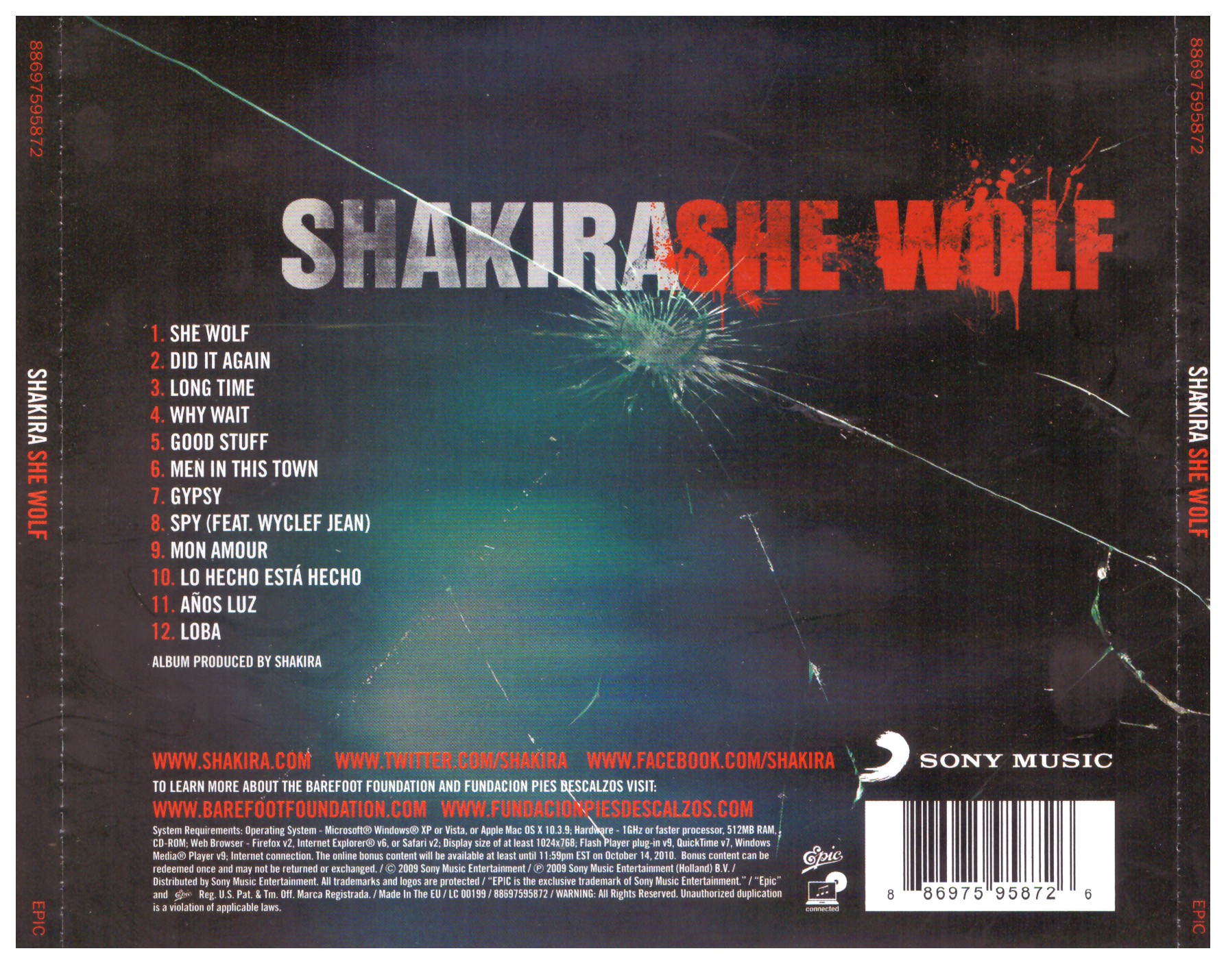 Shakira – She Wolf (2009) Epic – 88697595872 Trackliste 1 She Wolf 3:10 2 Did It Again 3:13 3 Long Time 2:56 4 Why Wait 3:43 5 Good Stuff 3:17 6 Men In This Town 3:35 7 Gypsy 3:18 8 Spy 3:27 9 Mon Amour 4:06 10 Lo Hecho Está Hecho 3:13 11 Años Luz 3:42 12 Loba 3:11 Booklet