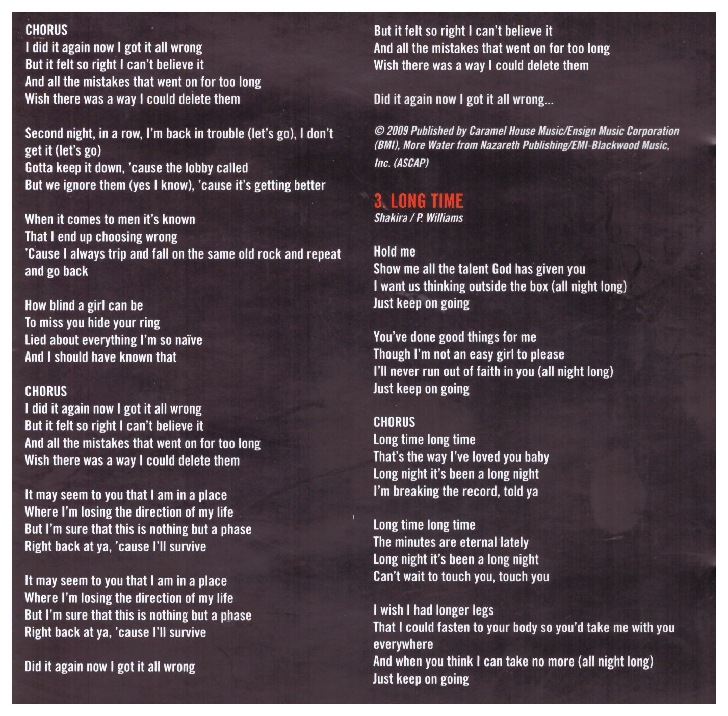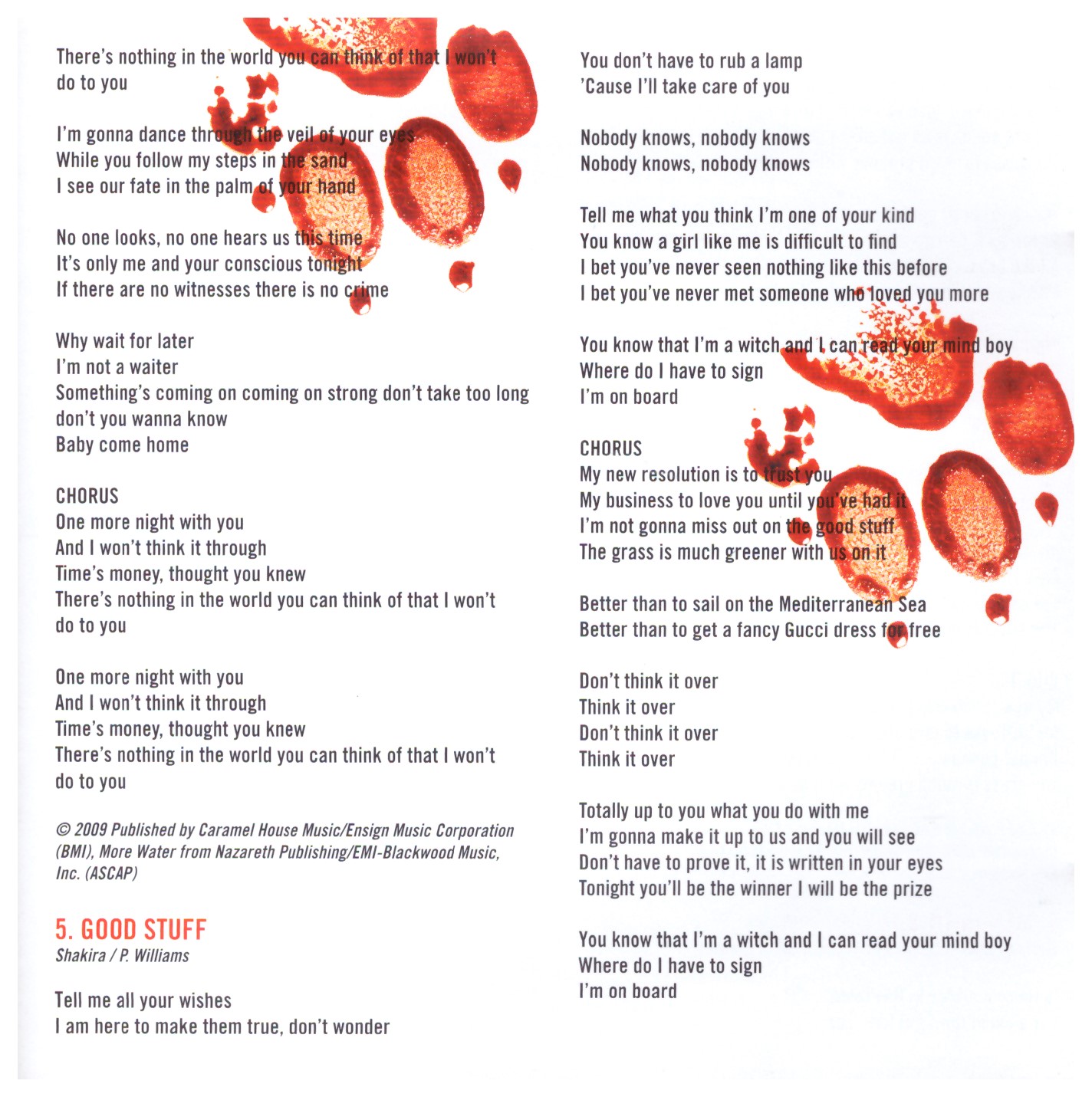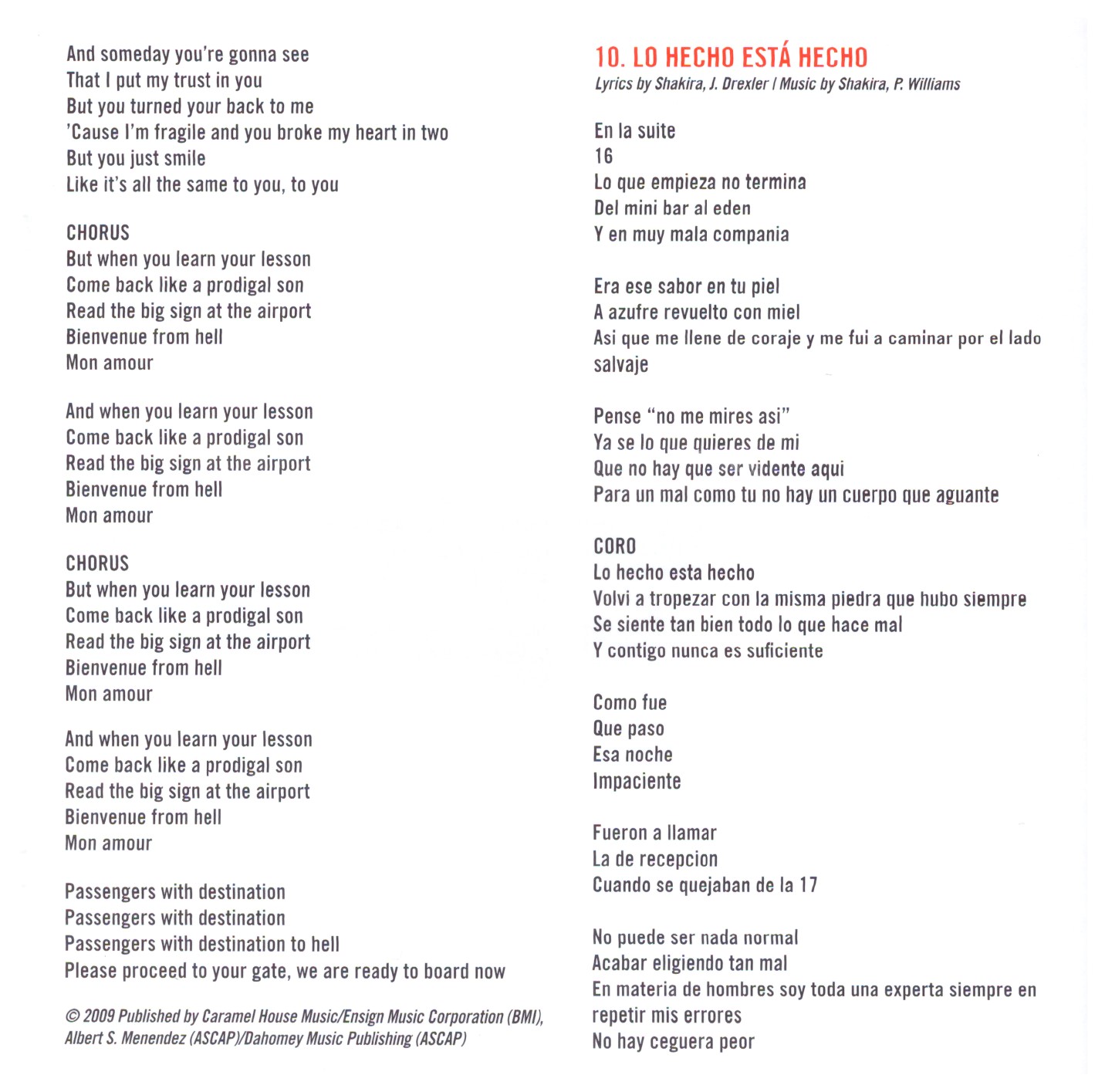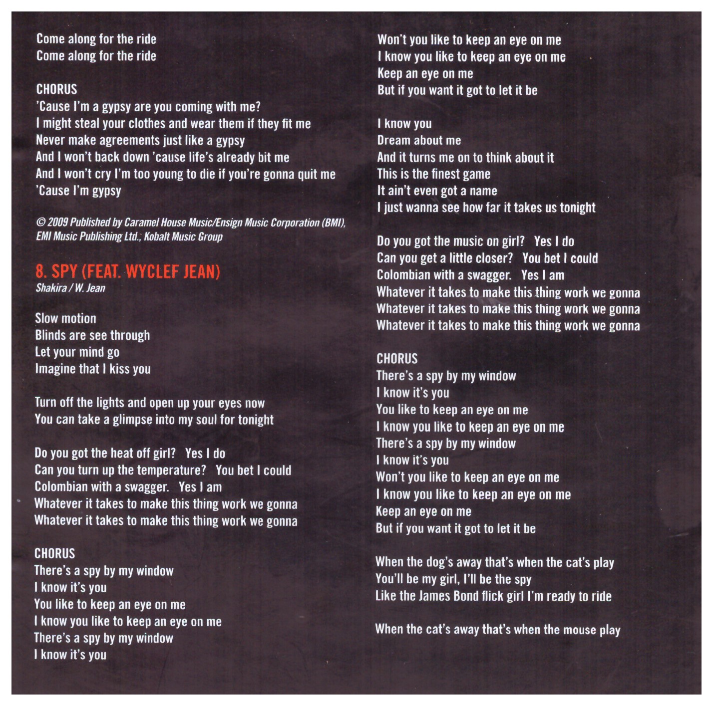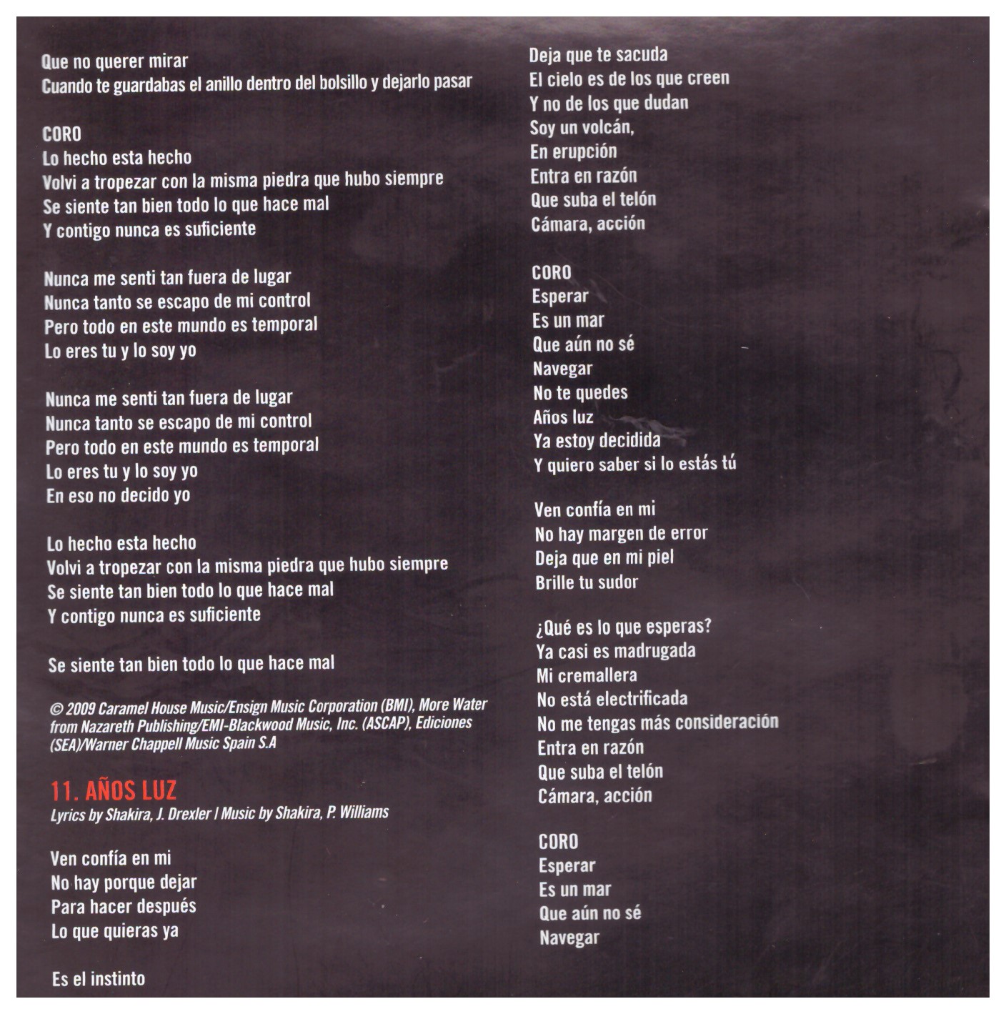 Shakira – She Wolf (2009) Epic – 88697595872 Trackliste 1 She Wolf 3:10 2 Did It Again 3:13 3 Long Time 2:56 4 Why Wait 3:43 5 Good Stuff 3:17 6 Men In This Town 3:35 7 Gypsy 3:18 8 Spy 3:27 9 Mon Amour 4:06 10 Lo Hecho Está Hecho 3:13 11 Años Luz 3:42 12 Loba 3:11 Booklet